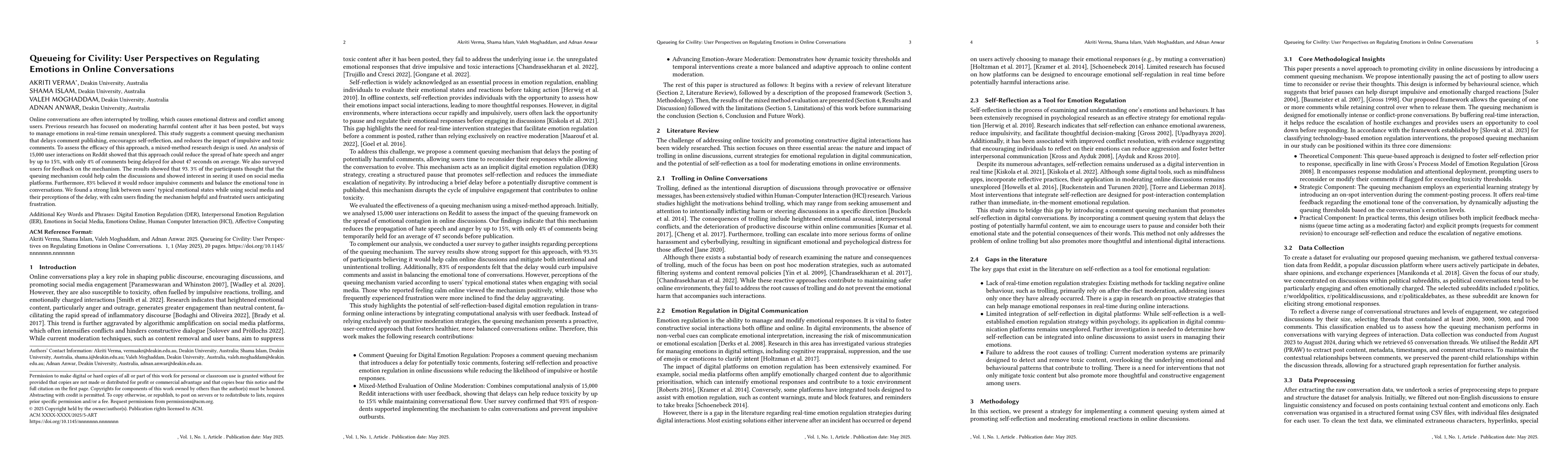 Online conversations are often interrupted by trolling, which causes emotional distress and conflict among users. Previous research has focused on moderating harmful content after it has been posted, but ways to manage emotions in real-time remain unexplored. This study suggests a comment queuing mechanism that delays comment publishing, encourages self-reflection, and reduces the impact of impulsive and toxic comments. To assess the efficacy of this approach, a mixed-method research design is used. An analysis of 15,000 user interactions on Reddit showed that this approach could reduce the spread of hate speech and anger by up to 15%, with only 4% of comments being delayed for about 47 seconds on average. We also surveyed users for feedback on the mechanism. The results showed that 93. 3\% of the participants thought that the queuing mechanism could help calm the discussions and showed interest in seeing it used on social media platforms. Furthermore, 83% believed it would reduce impulsive comments and balance the emotional tone in conversations. We found a strong link between users' typical emotional states while using social media and their perceptions of the delay, with calm users finding the mechanism helpful and frustrated users anticipating frustration.
