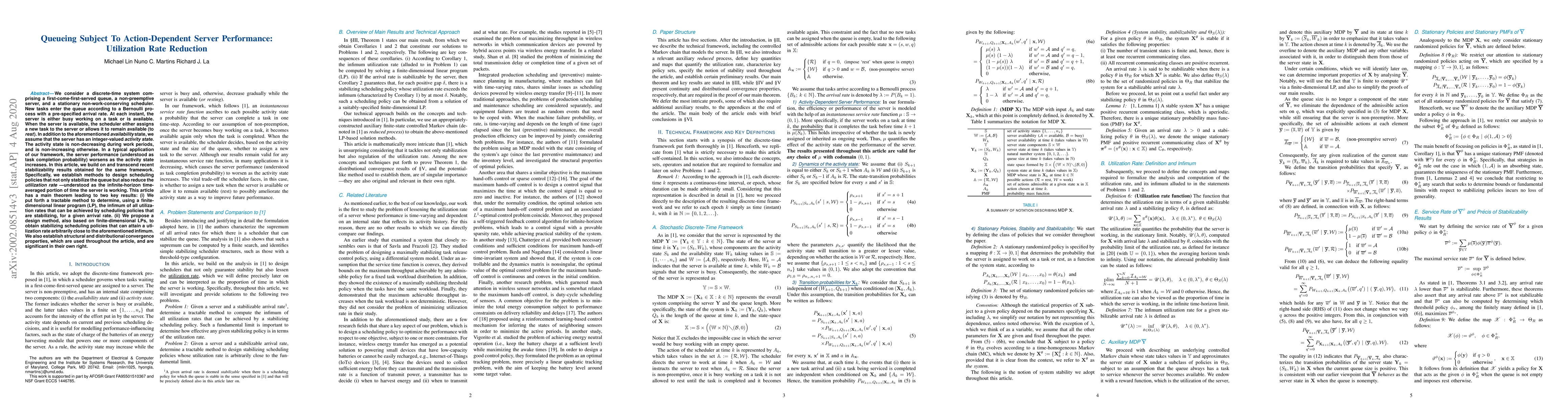 We consider a discrete-time system comprising a first-come-first-served queue, a non-preemptive server, and a stationary non-work-conserving scheduler. New tasks enter the queue according to a Bernoulli process with a pre-specified arrival rate. At each instant, the server is either busy working on a task or is available. When the server is available, the scheduler either assigns a new task to the server or allows it to remain available (to rest). In addition to the aforementioned availability state, we assume that the server has an integer-valued activity state. The activity state is non-decreasing during work periods, and is non-increasing otherwise. In a typical application of our framework, the server performance (understood as task completion probability) worsens as the activity state increases. In this article, we build on and transcend recent stabilizability results obtained for the same framework. Specifically, we establish methods to design scheduling policies that not only stabilize the queue but also reduce the utilization rate - understood as the infinite-horizon time-averaged portion of time the server is working. This article has a main theorem leading to two key results: (i) We put forth a tractable method to determine, using a finite-dimensional linear program (LP), the infimum of all utilization rates that can be achieved by scheduling policies that are stabilizing, for a given arrival rate. (ii) We propose a design method, also based on finite-dimensional LPs, to obtain stabilizing scheduling policies that can attain a utilization rate arbitrarily close to the aforementioned infimum. We also establish structural and distributional convergence properties, which are used throughout the article, and are significant in their own right.