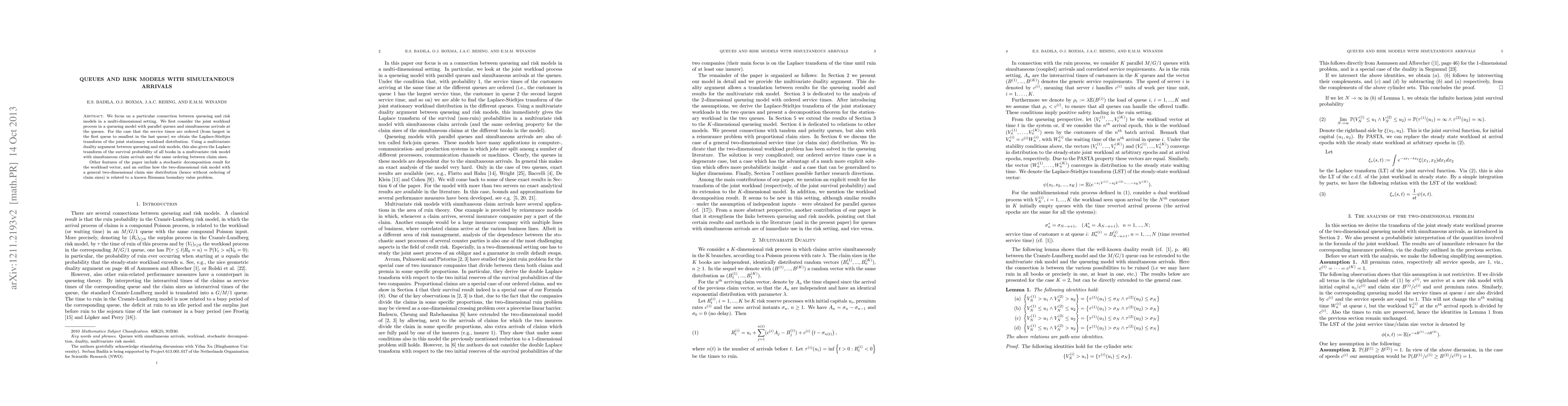 This paper explores the interplay between queueing and risk models in a multi-dimensional context, deriving the Laplace-Stieltjes transform of the joint stationary workload distribution in a parallel queue system with simultaneous arrivals. It also connects this to the Laplace transform of the survival probability in a multivariate risk model with simultaneous claim arrivals, leveraging a multivariate duality argument.