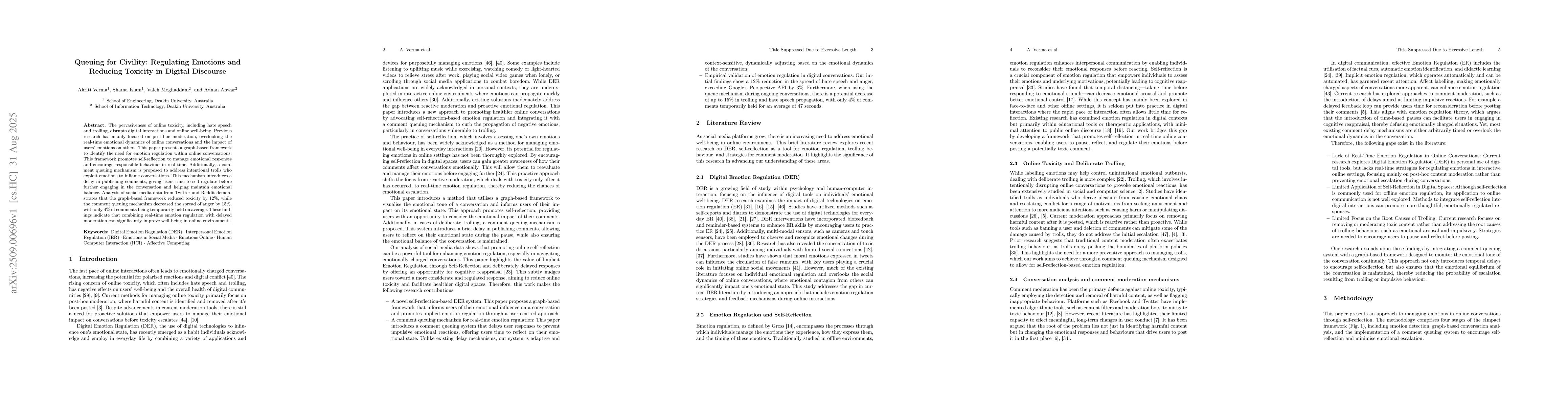 The pervasiveness of online toxicity, including hate speech and trolling, disrupts digital interactions and online well-being. Previous research has mainly focused on post-hoc moderation, overlooking the real-time emotional dynamics of online conversations and the impact of users' emotions on others. This paper presents a graph-based framework to identify the need for emotion regulation within online conversations. This framework promotes self-reflection to manage emotional responses and encourage responsible behaviour in real time. Additionally, a comment queuing mechanism is proposed to address intentional trolls who exploit emotions to inflame conversations. This mechanism introduces a delay in publishing comments, giving users time to self-regulate before further engaging in the conversation and helping maintain emotional balance. Analysis of social media data from Twitter and Reddit demonstrates that the graph-based framework reduced toxicity by 12%, while the comment queuing mechanism decreased the spread of anger by 15%, with only 4% of comments being temporarily held on average. These findings indicate that combining real-time emotion regulation with delayed moderation can significantly improve well-being in online environments.