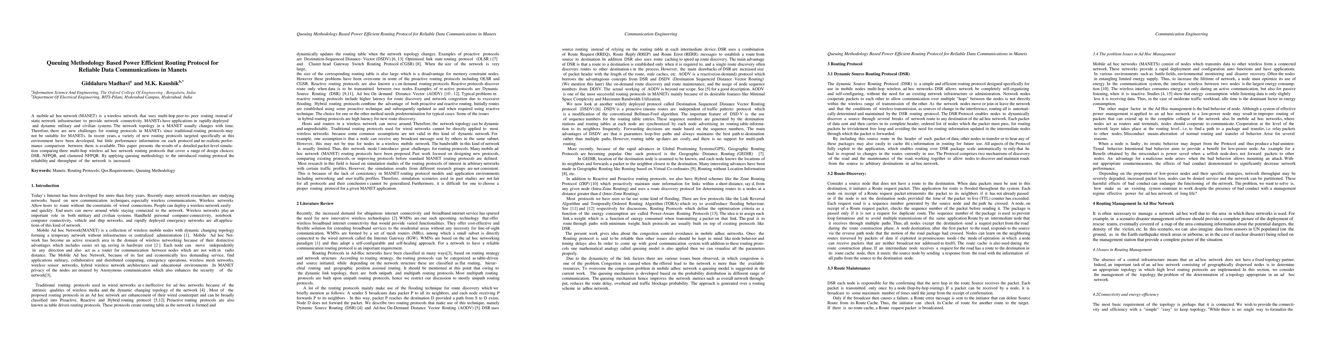 This paper presents a detailed simulation comparing three multi-hop routing protocols for MANETs—DSR, NFPQR, and clustered NFPQR—using queuing methodology to enhance power efficiency, reliability, and throughput. The study aims to provide a realistic performance comparison to guide future protocol development.
