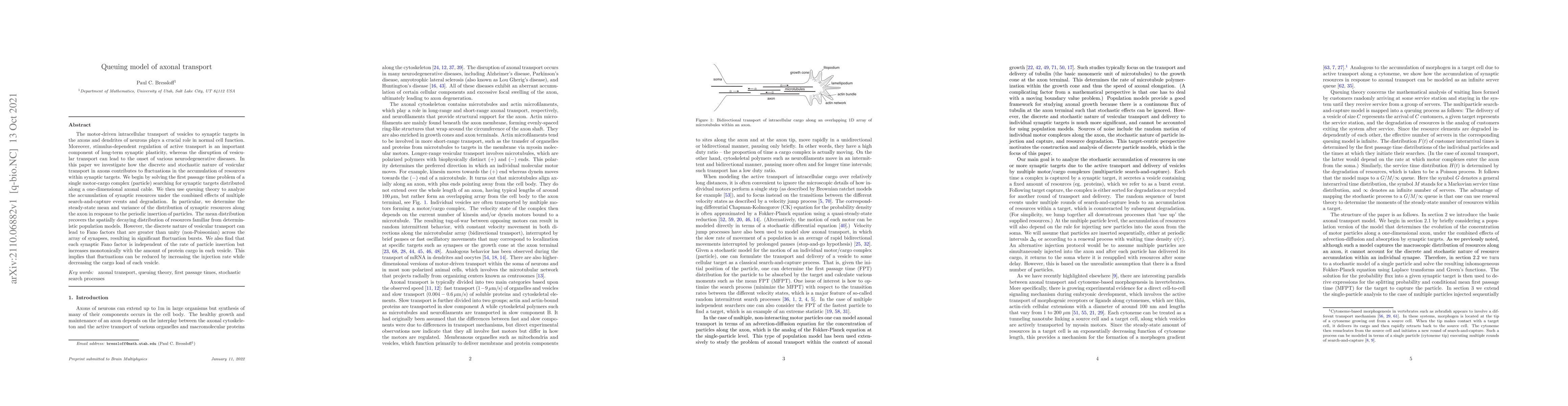 This study uses queuing theory to analyze how vesicle transport in axons affects synaptic resource accumulation, finding that discrete transport can lead to non-Poissonian fluctuations with increased cargo load.