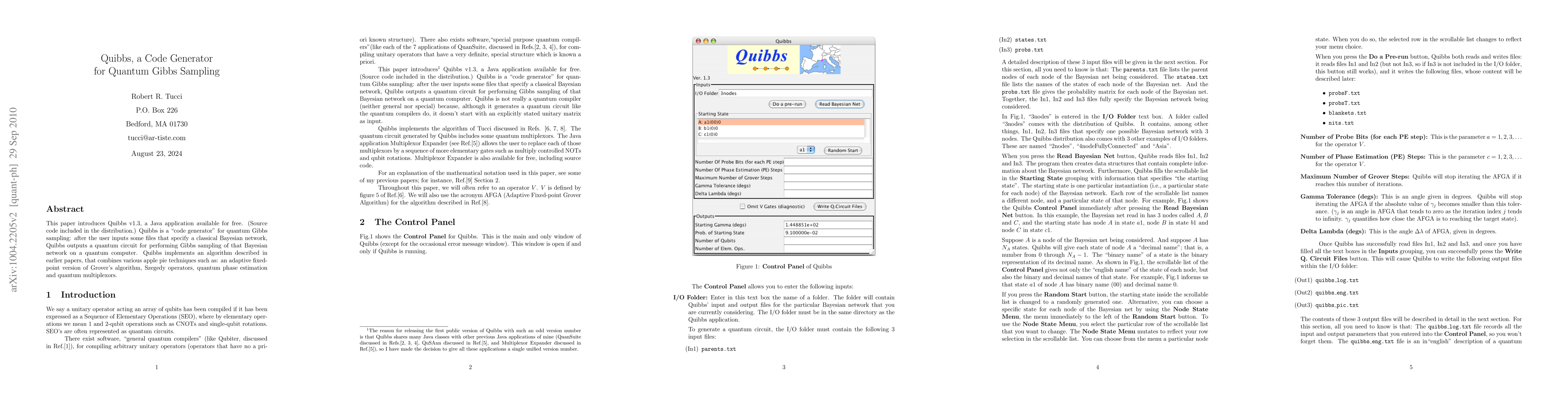 This paper introduces Quibbs v1.3, a Java application available for free. (Source code included in the distribution.) Quibbs is a "code generator" for quantum Gibbs sampling: after the user inputs some files that specify a classical Bayesian network, Quibbs outputs a quantum circuit for performing Gibbs sampling of that Bayesian network on a quantum computer. Quibbs implements an algorithm described in earlier papers, that combines various apple pie techniques such as: an adaptive fixed-point version of Grover's algorithm, Szegedy operators, quantum phase estimation and quantum multiplexors.