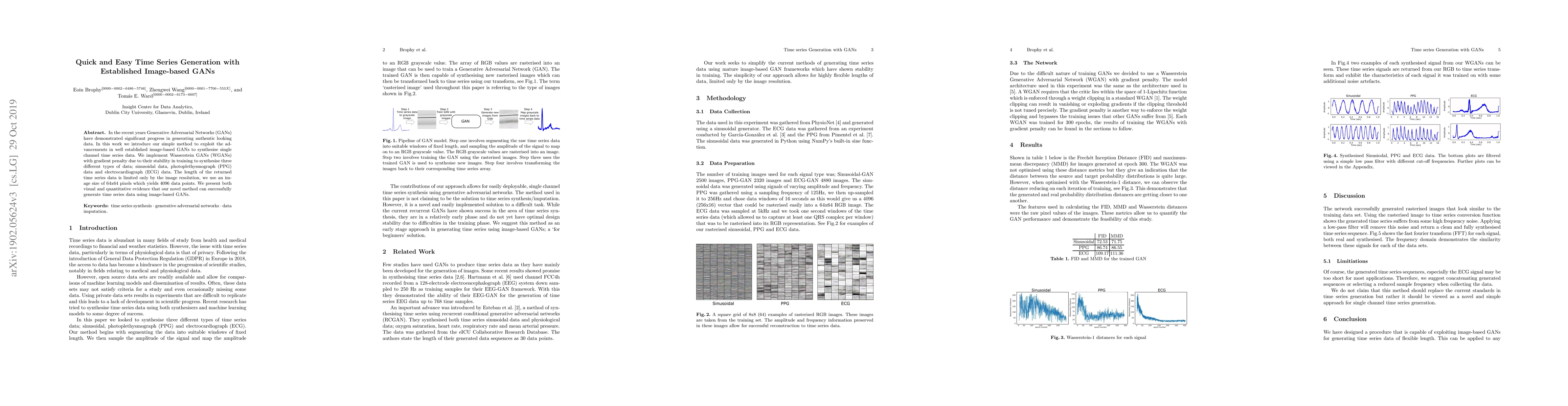 In the recent years Generative Adversarial Networks (GANs) have demonstrated significant progress in generating authentic looking data. In this work we introduce our simple method to exploit the advancements in well established image-based GANs to synthesise single channel time series data. We implement Wasserstein GANs (WGANs) with gradient penalty due to their stability in training to synthesise three different types of data; sinusoidal data, photoplethysmograph (PPG) data and electrocardiograph (ECG) data. The length of the returned time series data is limited only by the image resolution, we use an image size of 64x64 pixels which yields 4096 data points. We present both visual and quantitative evidence that our novel method can successfully generate time series data using image-based GANs.