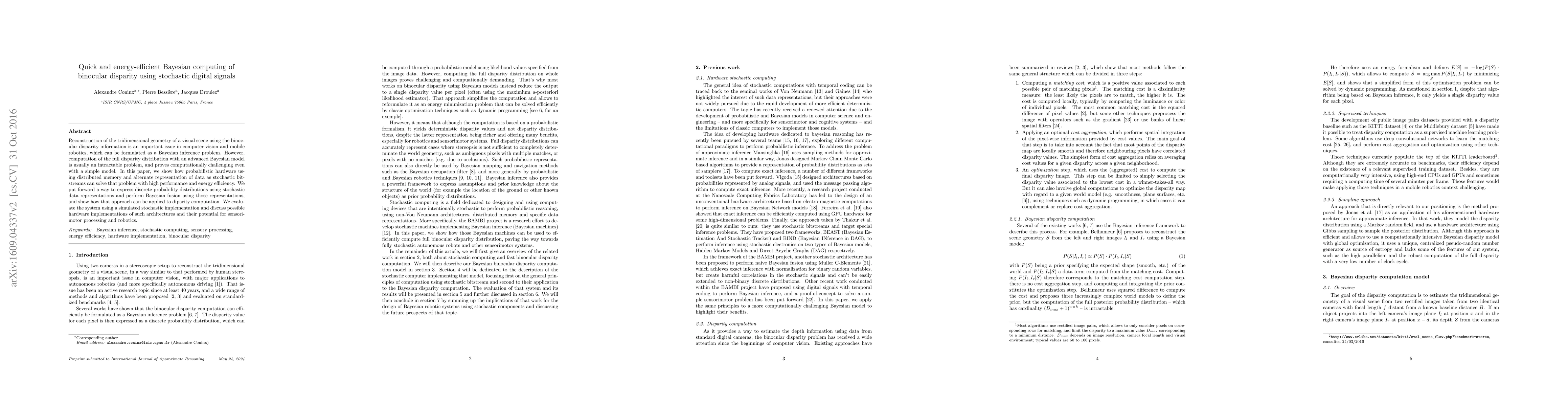 This paper proposes a method for efficiently computing binocular disparity using probabilistic hardware and stochastic digital signals, enabling high-performance and energy-efficient Bayesian inference. The approach utilizes stochastic bitstreams to represent probability distributions and perform Bayesian fusion, demonstrating potential applications in computer vision and robotics.