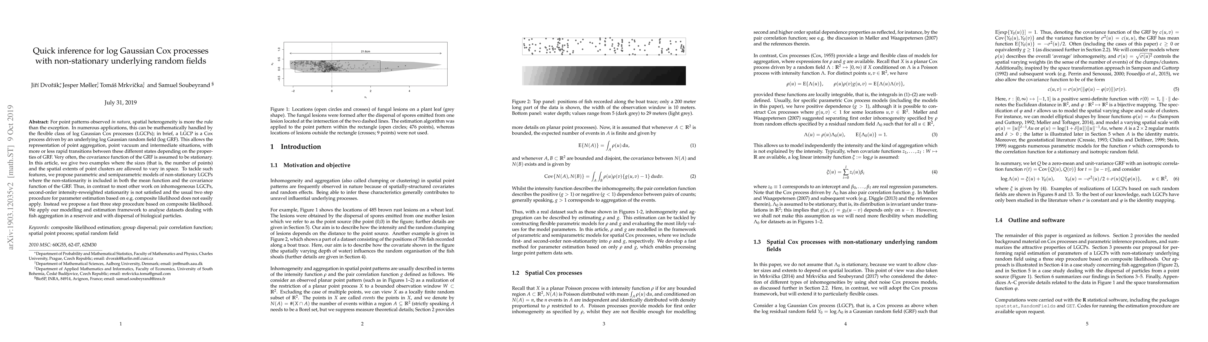 This paper proposes new parametric and semiparametric models for non-stationary log Gaussian Cox processes (LGCPs) to handle spatial heterogeneity in point patterns. It introduces a fast three-step procedure for parameter estimation based on composite likelihood, contrasting with traditional methods that assume stationarity. The approach is demonstrated through analyses of fish aggregation and biological particle dispersal datasets.