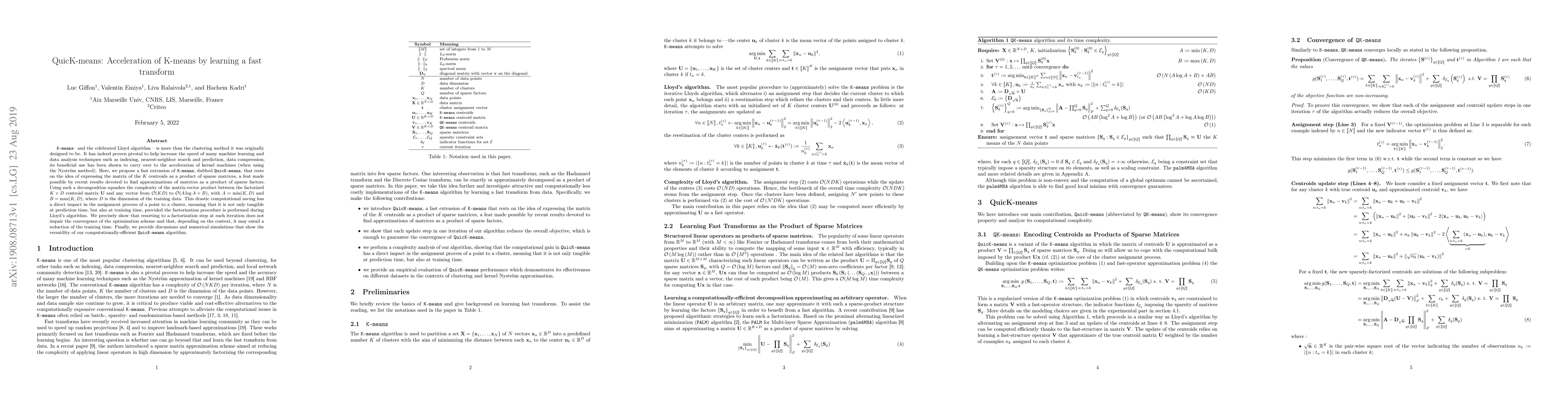 QuicK-means accelerates the K-means clustering algorithm by decomposing the centroid matrix into sparse matrices, reducing the complexity of matrix-vector products from $\mathcal{O}(K D)$ to $\mathcal{O}(A \log A+B)$. This factorization improves both training and prediction times without compromising convergence.