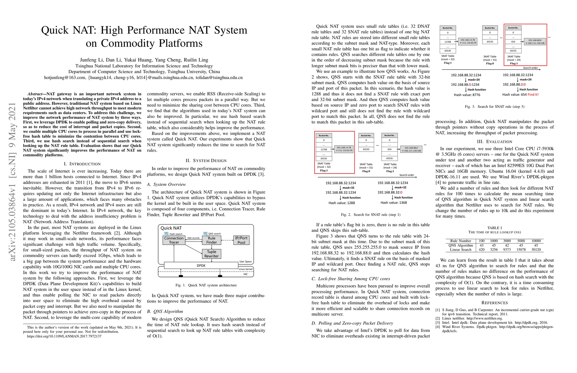 NAT gateway is an important network system in today's IPv4 network when translating a private IPv4 address to a public address. However, traditional NAT system based on Linux Netfilter cannot achieve high network throughput to meet modern requirements such as data centers. To address this challenge, we improve the network performance of NAT system by three ways. First, we leverage DPDK to enable polling and zero-copy delivery, so as to reduce the cost of interrupt and packet copies. Second, we enable multiple CPU cores to process in parallel and use lock-free hash table to minimize the contention between CPU cores. Third, we use hash search instead of sequential search when looking up the NAT rule table. Evaluation shows that our Quick NAT system significantly improves the performance of NAT on commodity platforms.