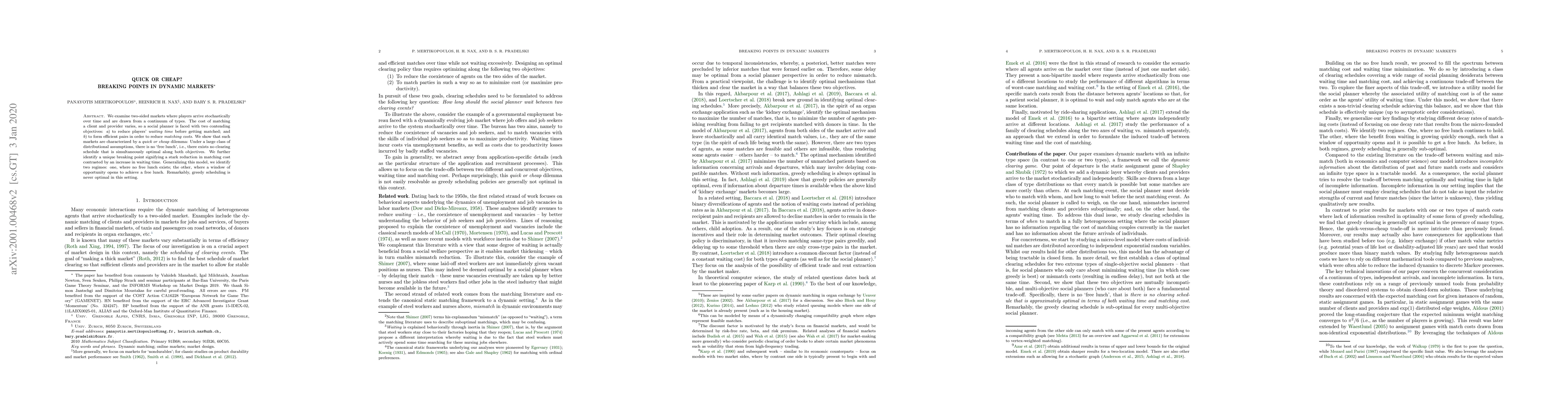 We examine two-sided markets where players arrive stochastically over time and are drawn from a continuum of types. The cost of matching a client and provider varies, so a social planner is faced with two contending objectives: a) to reduce players' waiting time before getting matched; and b) to form efficient pairs in order to reduce matching costs. We show that such markets are characterized by a quick-or-cheap dilemma: Under a large class of distributional assumptions, there is no 'free lunch', i.e., there exists no clearing schedule that is simultaneously optimal along both objectives. We further identify a unique breaking point signifying a stark reduction in matching cost contrasted by an increase in waiting time. Generalizing this model, we identify two regimes: one, where no free lunch exists; the other, where a window of opportunity opens to achieve a free lunch. Remarkably, greedy scheduling is never optimal in this setting.