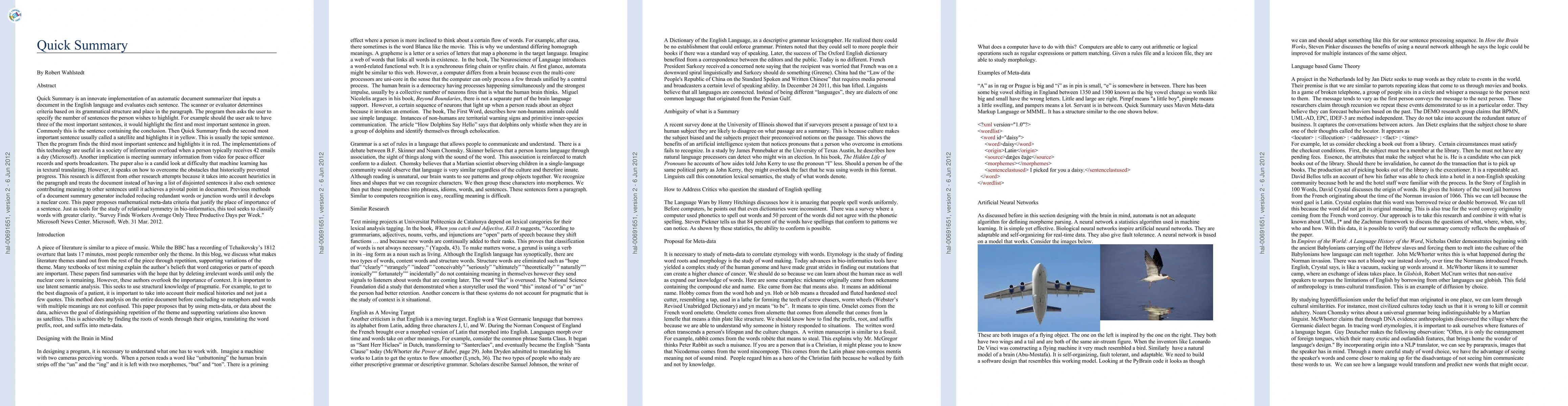 Quick Summary is an innovate implementation of an automatic document summarizer that inputs a document in the English language and evaluates each sentence. The scanner or evaluator determines criteria based on its grammatical structure and place in the paragraph. The program then asks the user to specify the number of sentences the person wishes to highlight. For example should the user ask to have three of the most important sentences, it would highlight the first and most important sentence in green. Commonly this is the sentence containing the conclusion. Then Quick Summary finds the second most important sentence usually called a satellite and highlights it in yellow. This is usually the topic sentence. Then the program finds the third most important sentence and highlights it in red. The implementations of this technology are useful in a society of information overload when a person typically receives 42 emails a day (Microsoft). The paper also is a candid look at difficulty that machine learning has in textural translating. However, it speaks on how to overcome the obstacles that historically prevented progress. This paper proposes mathematical meta-data criteria that justify the place of importance of a sentence. Just as tools for the study of relational symmetry in bio-informatics, this tool seeks to classify words with greater clarity. "Survey Finds Workers Average Only Three Productive Days per Week." Microsoft News Center. Microsoft. Web. 31 Mar. 2012.