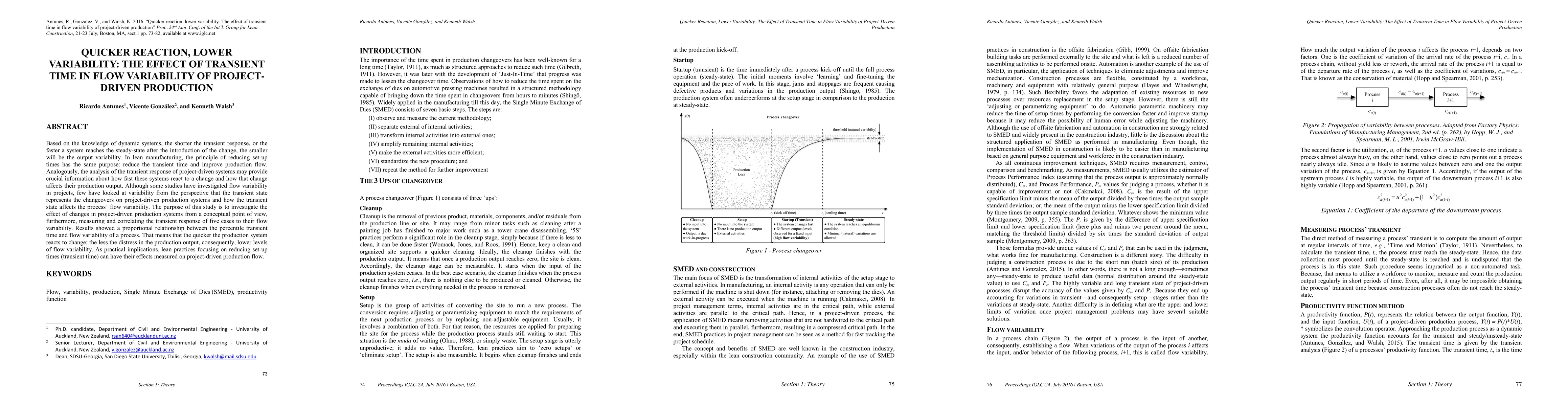 This study investigates how transient response time in project-driven production systems affects flow variability, finding that quicker reactions to change lead to lower output variability. Lean practices aimed at reducing set-up times can thus be measured for their impact on production flow efficiency.