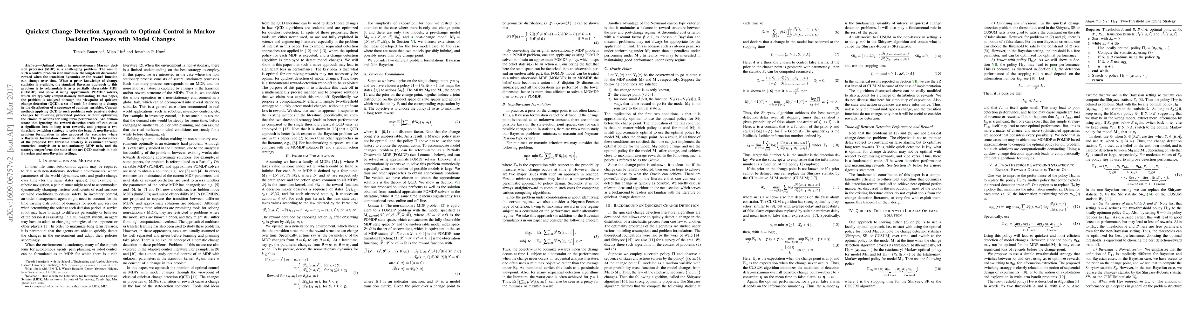 Optimal control in non-stationary Markov decision processes (MDP) is a challenging problem. The aim in such a control problem is to maximize the long-term discounted reward when the transition dynamics or the reward function can change over time. When a prior knowledge of change statistics is available, the standard Bayesian approach to this problem is to reformulate it as a partially observable MDP (POMDP) and solve it using approximate POMDP solvers, which are typically computationally demanding. In this paper, the problem is analyzed through the viewpoint of quickest change detection (QCD), a set of tools for detecting a change in the distribution of a sequence of random variables. Current methods applying QCD to such problems only passively detect changes by following prescribed policies, without optimizing the choice of actions for long term performance. We demonstrate that ignoring the reward-detection trade-off can cause a significant loss in long term rewards, and propose a two threshold switching strategy to solve the issue. A non-Bayesian problem formulation is also proposed for scenarios where a Bayesian formulation cannot be defined. The performance of the proposed two threshold strategy is examined through numerical analysis on a non-stationary MDP task, and the strategy outperforms the state-of-the-art QCD methods in both Bayesian and non-Bayesian settings.