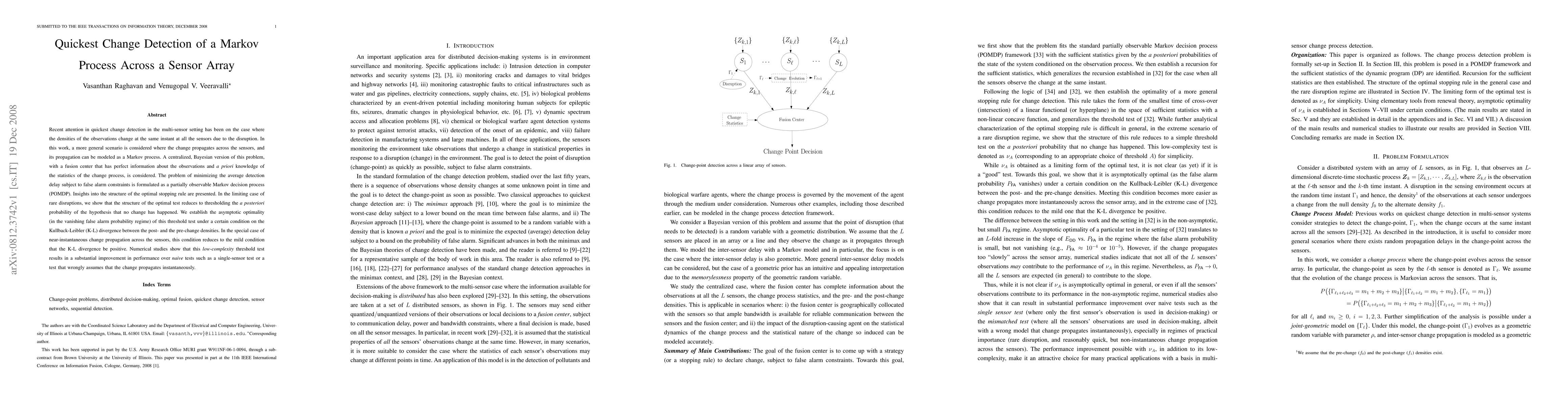 Recent attention in quickest change detection in the multi-sensor setting has been on the case where the densities of the observations change at the same instant at all the sensors due to the disruption. In this work, a more general scenario is considered where the change propagates across the sensors, and its propagation can be modeled as a Markov process. A centralized, Bayesian version of this problem, with a fusion center that has perfect information about the observations and a priori knowledge of the statistics of the change process, is considered. The problem of minimizing the average detection delay subject to false alarm constraints is formulated as a partially observable Markov decision process (POMDP). Insights into the structure of the optimal stopping rule are presented. In the limiting case of rare disruptions, we show that the structure of the optimal test reduces to thresholding the a posteriori probability of the hypothesis that no change has happened. We establish the asymptotic optimality (in the vanishing false alarm probability regime) of this threshold test under a certain condition on the Kullback-Leibler (K-L) divergence between the post- and the pre-change densities. In the special case of near-instantaneous change propagation across the sensors, this condition reduces to the mild condition that the K-L divergence be positive. Numerical studies show that this low complexity threshold test results in a substantial improvement in performance over naive tests such as a single-sensor test or a test that wrongly assumes that the change propagates instantaneously.
