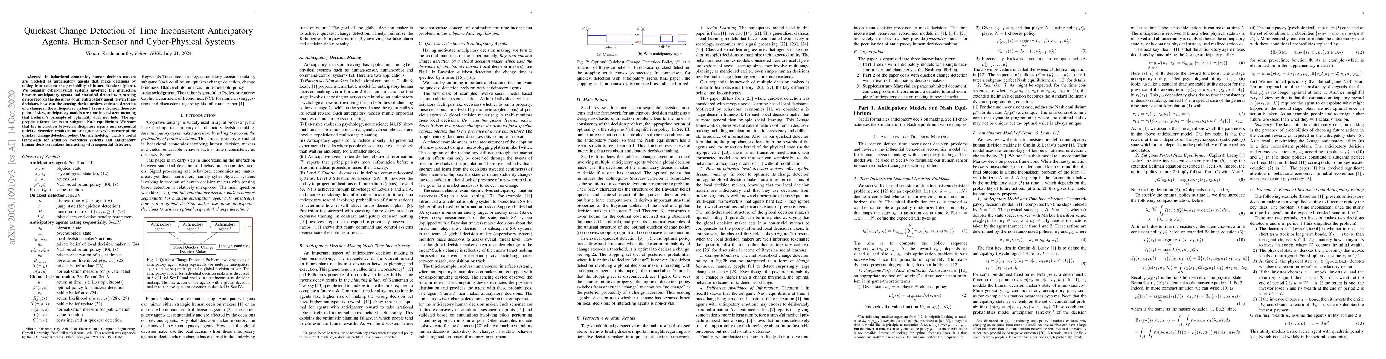 In behavioral economics, human decision makers are modeled as anticipatory agents that make decisions by taking into account the probability of future decisions (plans). We consider cyber-physical systems involving the interaction between anticipatory agents and statistical detection. A sensing device records the decisions of an anticipatory agent. Given these decisions, how can the sensing device achieve quickest detection of a change in the anticipatory system? From a decision theoretic point of view, anticipatory models are time inconsistent meaning that Bellman's principle of optimality does not hold. The appropriate formalism is the subgame Nash equilibrium. We show that the interaction between anticipatory agents and sequential quickest detection results in unusual (nonconvex) structure of the quickest change detection policy. Our methodology yields a useful framework for situation awareness systems and anticipatory human decision makers interacting with sequential detectors.