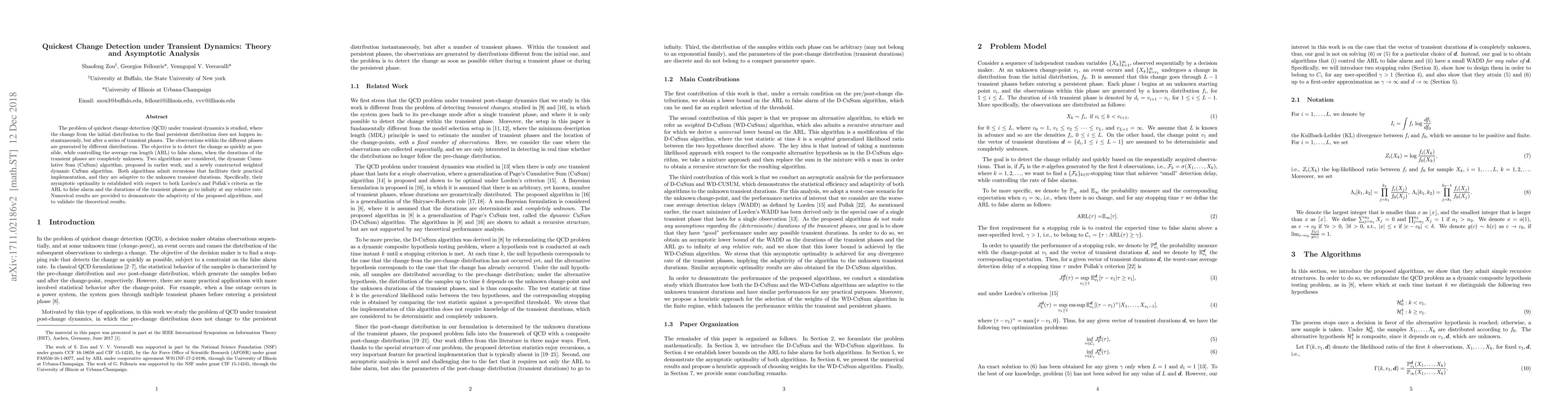 This paper studies quickest change detection under transient dynamics, proposing two adaptive algorithms: a dynamic CuSum and a weighted dynamic CuSum. Both algorithms are shown to be asymptotically optimal under various criteria, and numerical results validate their effectiveness.