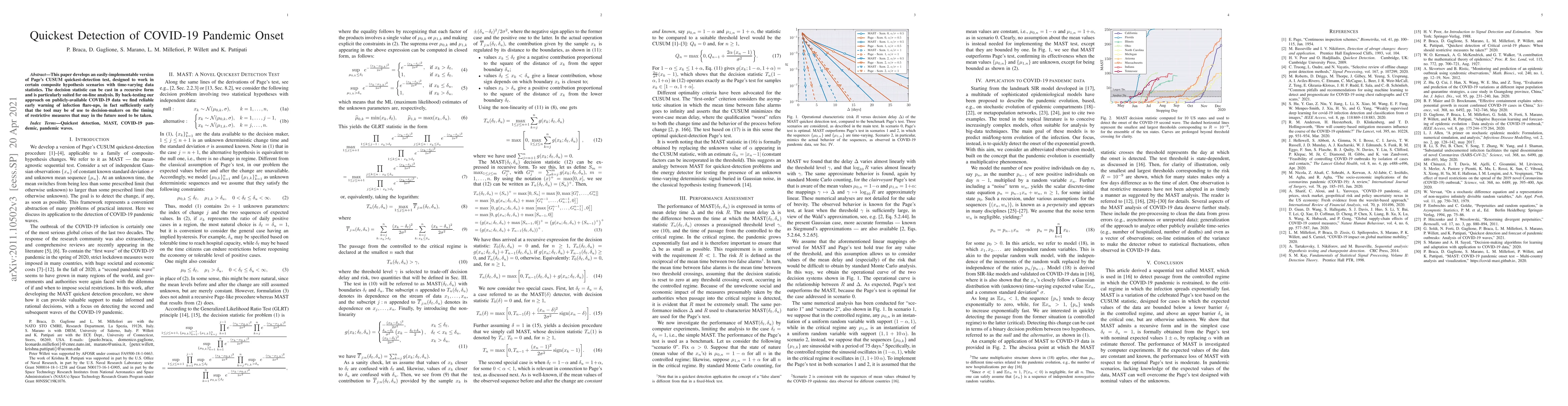 This paper develops an efficient method to detect the onset of the COVID-19 pandemic early on, using a CUSUM quickest-detection test, which shows promise for informing decision-makers about infection flare-ups.