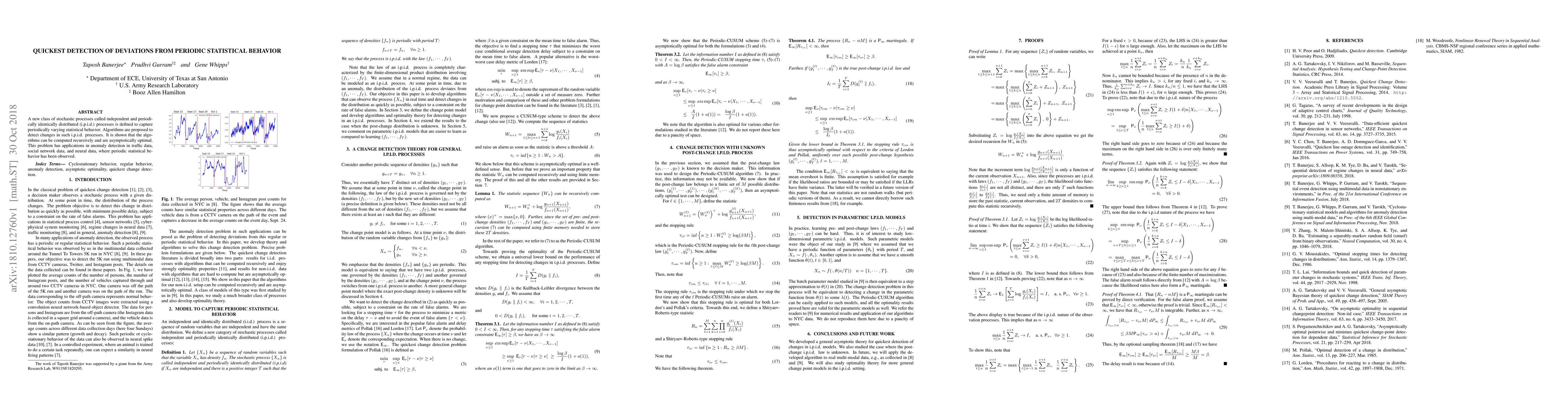 This paper introduces a new class of stochastic processes, i.p.i.d. processes, to model periodic statistical behavior and proposes recursive algorithms for detecting changes in these processes. The algorithms are shown to be asymptotically optimal and have applications in anomaly detection in traffic, social network, and neural data.