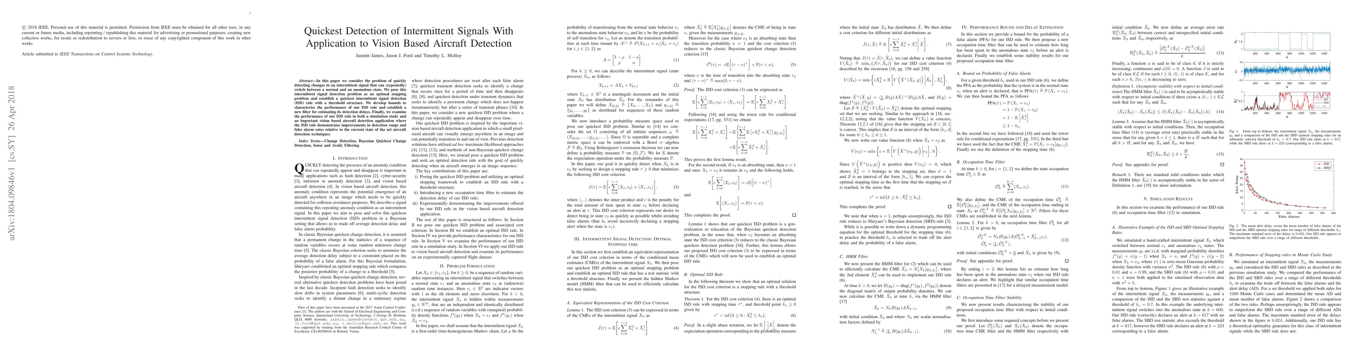 In this paper we consider the problem of quickly detecting changes in an intermittent signal that can (repeatedly) switch between a normal and an anomalous state. We pose this intermittent signal detection problem as an optimal stopping problem and establish a quickest intermittent signal detection (ISD) rule with a threshold structure. We develop bounds to characterise the performance of our ISD rule and establish a new filter for estimating its detection delays. Finally, we examine the performance of our ISD rule in both a simulation study and an important vision based aircraft detection application where the ISD rule demonstrates improvements in detection range and false alarm rates relative to the current state of the art aircraft detection techniques.