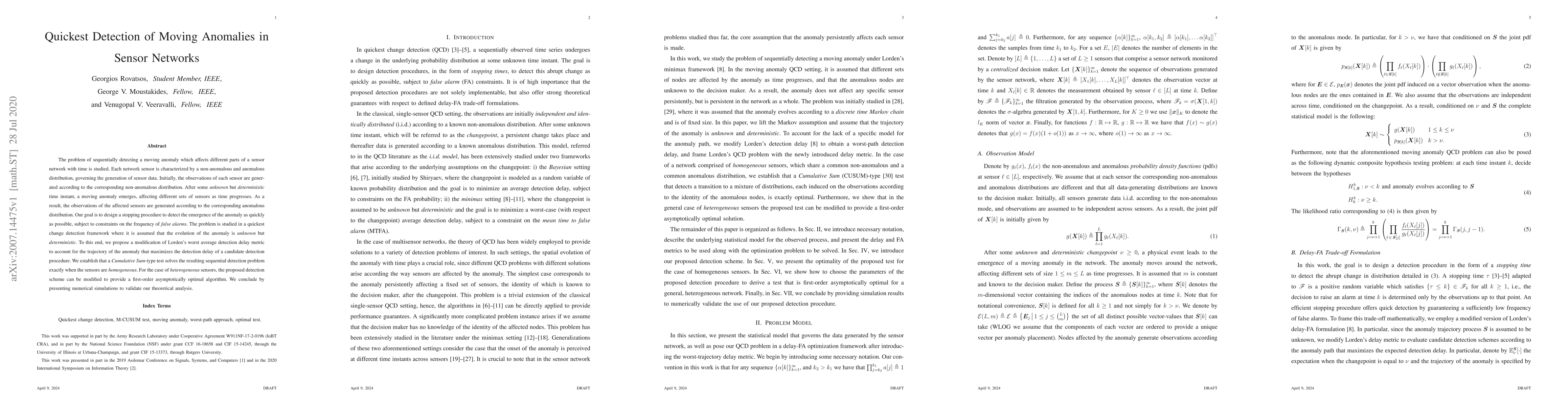 This paper proposes a detection procedure for identifying moving anomalies in sensor networks, aiming to minimize detection delay while controlling false alarm rates. It utilizes a modified Cumulative Sum-type test, achieving exact solutions for homogeneous sensors and first-order asymptotic optimality for heterogeneous sensors, validated through numerical simulations.
