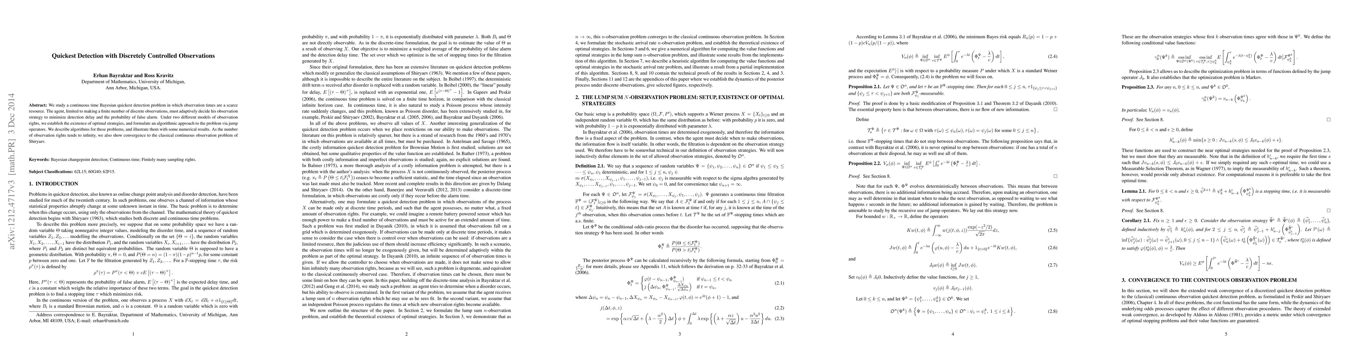 This paper explores a Bayesian quickest detection problem where observation times are limited, requiring the agent to optimally decide on a finite number of discrete observations to minimize detection delay and false alarm probability. It establishes optimal strategies under two observation models and provides algorithmic solutions, demonstrating convergence to the classical continuous observation problem as the number of observation rights increases.