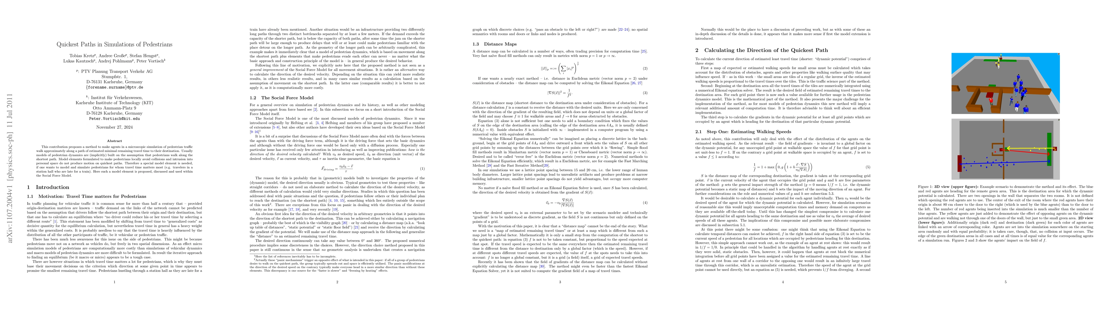 This contribution proposes a method to make agents in a microscopic simulation of pedestrian traffic walk approximately along a path of estimated minimal remaining travel time to their destination. Usually models of pedestrian dynamics are (implicitly) built on the assumption that pedestrians walk along the shortest path. Model elements formulated to make pedestrians locally avoid collisions and intrusion into personal space do not produce motion on quickest paths. Therefore a special model element is needed, if one wants to model and simulate pedestrians for whom travel time matters most (e.g. travelers in a station hall who are late for a train). Here such a model element is proposed, discussed and used within the Social Force Model.
