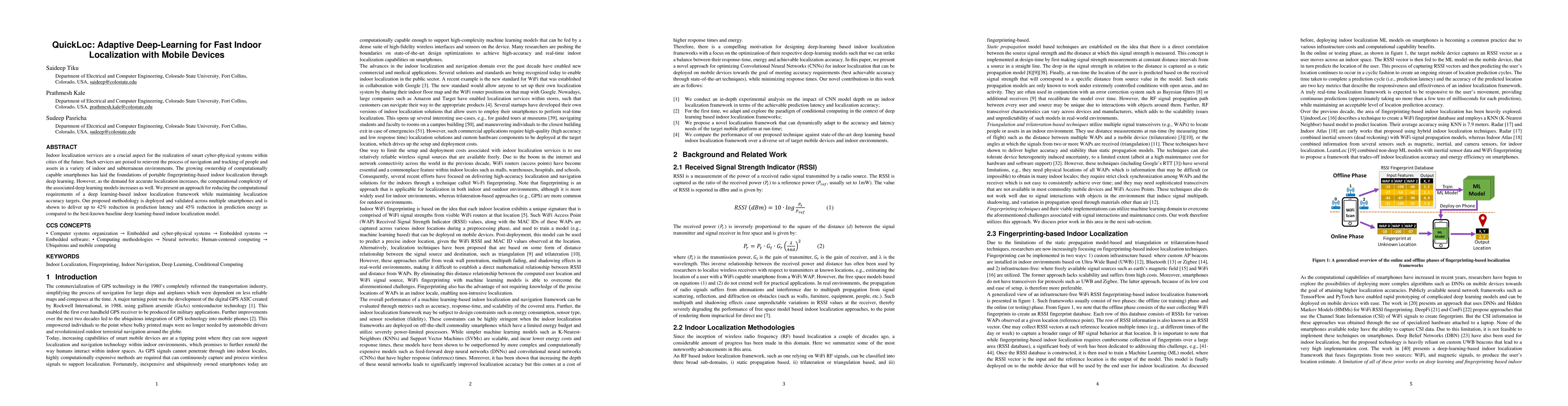 QuickLoc employs adaptive deep learning to enhance fast indoor localization with mobile devices, achieving up to 42% reduction in prediction latency and 45% reduction in energy consumption compared to existing models. This approach maintains high localization accuracy, crucial for smart cyber-physical systems.