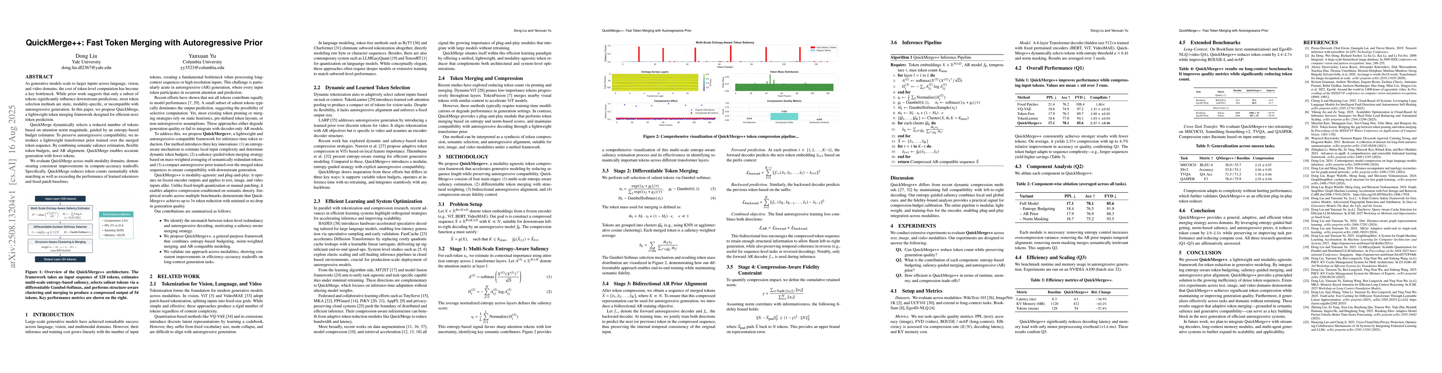 As generative models scale to larger inputs across language, vision, and video domains, the cost of token-level computation has become a key bottleneck. While prior work suggests that only a subset of tokens significantly influence downstream predictions, most token selection methods are static, modality-specific, or incompatible with autoregressive generation. In this paper, we propose QuickMerge, a lightweight token merging framework designed for efficient next-token prediction. QuickMerge dynamically selects a reduced number of tokens based on attention norm magnitude, guided by an entropy-based budget estimator. To preserve autoregressive compatibility, we introduce a lightweight transformer prior trained over the merged token sequence. By combining semantic salience estimation, flexible token budgets, and AR alignment, QuickMerge enables accurate generation with fewer tokens. We evaluate QuickMerge across multi-modality domains, demonstrating consistent improvements in compute-accuracy tradeoffs. Specifically, QuickMerge reduces token counts sustantially while matching as well as exceeding the performance of learned tokenizers and fixed-patch baselines.