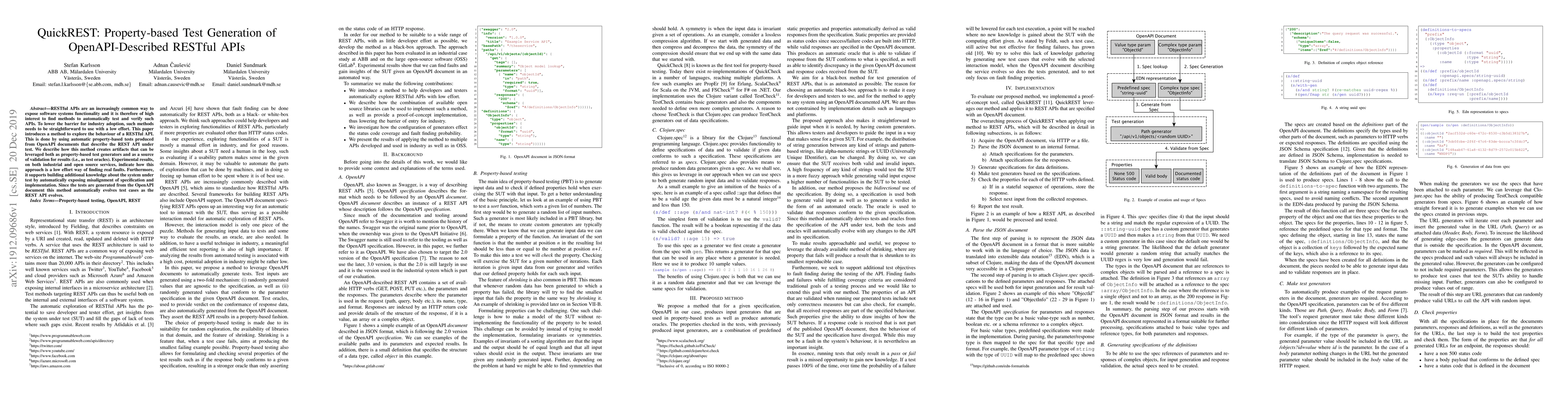 This paper introduces QuickREST, a method for generating property-based tests for RESTful APIs using OpenAPI documents, aiming to lower the testing effort and automatically evolve tests with API changes. Experimental results show it effectively finds real faults and reveals specification-implementation misalignments.
