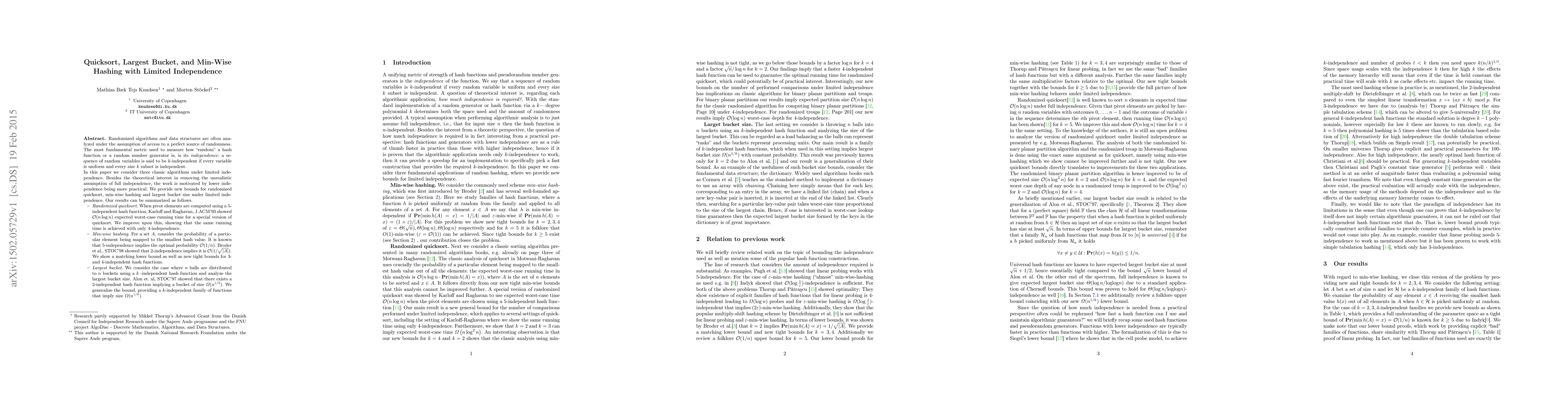 This paper investigates the performance of three classic randomized algorithms—quicksort, min-wise hashing, and largest bucket size—under limited independence of random variables. It demonstrates improved bounds for these algorithms using lower degrees of independence, showing $O(n \log n)$ running time for quicksort with $4$-independence, optimal min-wise hashing probabilities with $3$-independence, and largest bucket size bounds generalized to $k$-independence.