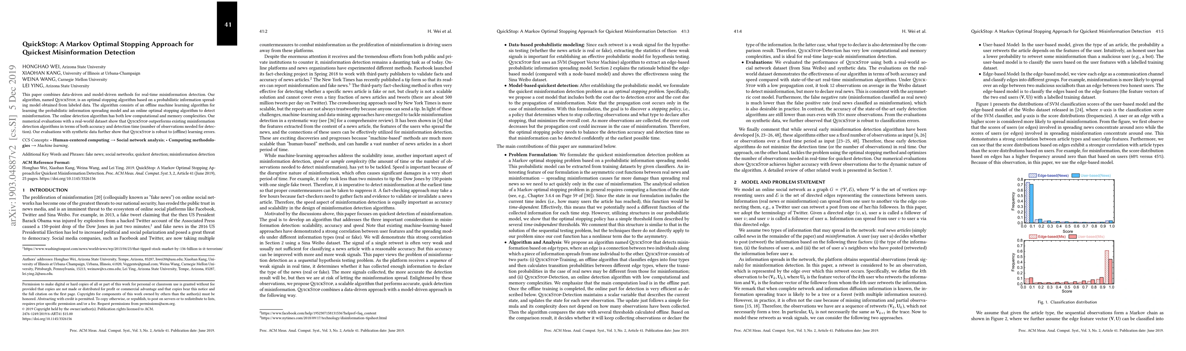 This paper combines data-driven and model-driven methods for real-time misinformation detection. Our algorithm, named QuickStop, is an optimal stopping algorithm based on a probabilistic information spreading model obtained from labeled data. The algorithm consists of an offline machine learning algorithm for learning the probabilistic information spreading model and an online optimal stopping algorithm to detect misinformation. The online detection algorithm has both low computational and memory complexities. Our numerical evaluations with a real-world dataset show that QuickStop outperforms existing misinformation detection algorithms in terms of both accuracy and detection time (number of observations needed for detection). Our evaluations with synthetic data further show that QuickStop is robust to (offline) learning errors.