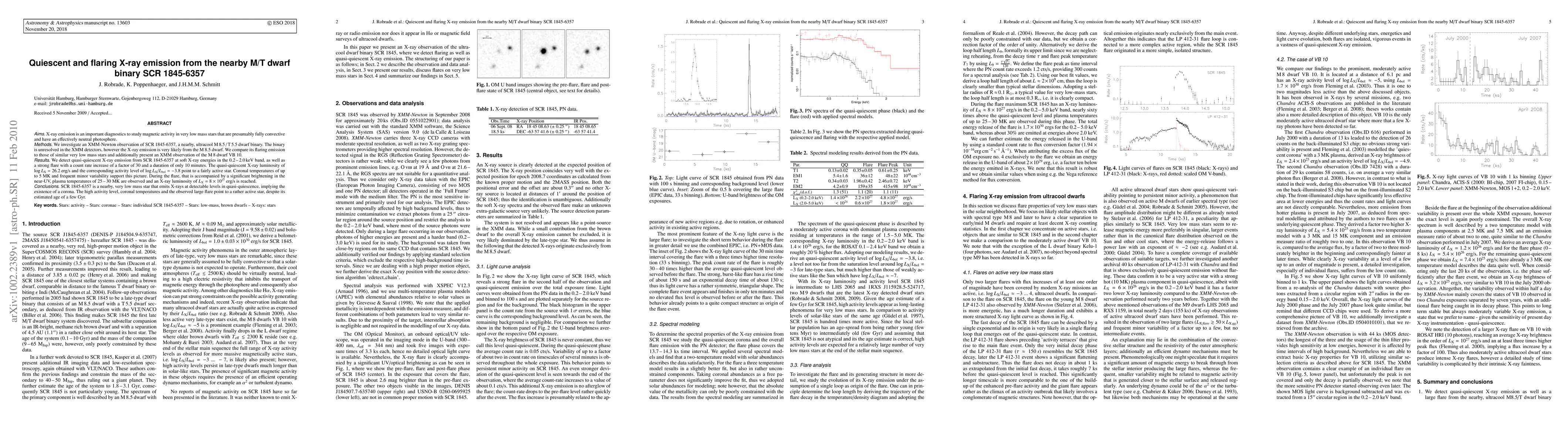 This paper investigates the X-ray emission from the nearby M/T dwarf binary SCR 1845-6357 using XMM-Newton observations, revealing both quasi-quiescent and strong flaring activity, with the latter reaching an X-ray luminosity of 8 x 10^27 erg/s. The findings indicate a highly active corona despite the star's estimated age of a few billion years.