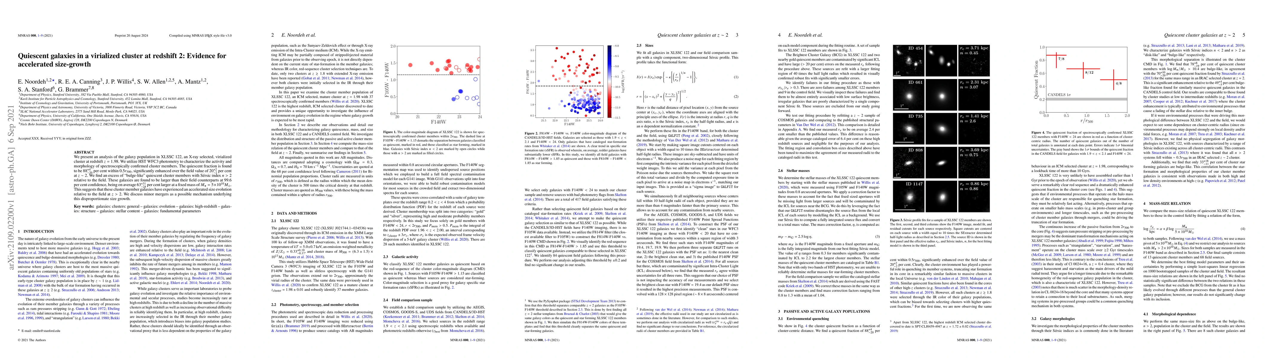 We present an analysis of the galaxy population in XLSSC 122, an X-ray selected, virialized cluster at redshift $z=1.98$. We utilize HST WFC3 photometry to characterize the activity and morphology of spectroscopically confirmed cluster members. The quiescent fraction is found to be $88^{+4}_{-20}$ per cent within 0.5$r_{500}$, significantly enhanced over the field value of $20^{+2}_{-2}$ per cent at $z\sim2$. We find an excess of "bulge-like" quiescent cluster members with Sersic index $n>2$ relative to the field. These galaxies are found to be larger than their field counterparts at 99.6 per cent confidence, being on average $63^{+31}_{-24}$ per cent larger at a fixed mass of $M_\star = 5\times10^{10} M_\odot$. This suggests that these cluster member galaxies have experienced an accelerated size evolution relative to the field at $z>2$. We discuss minor mergers as a possible mechanism underlying this disproportionate size growth.
