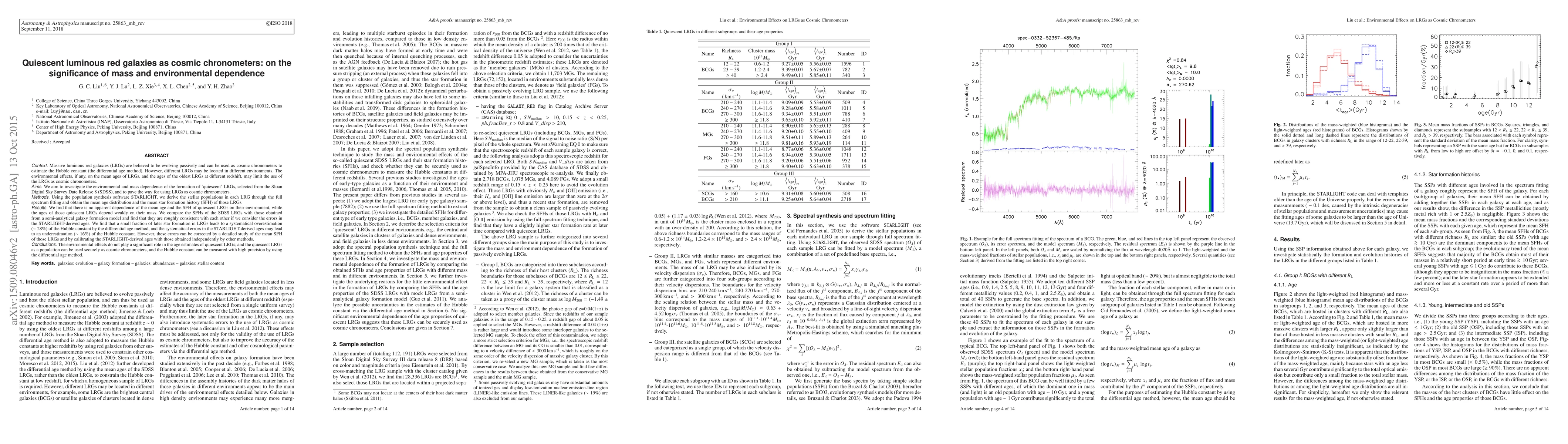 Massive luminous red galaxies (LRGs) are believed to be evolving passively and can be used as cosmic chronometers to estimate the Hubble constant. However, different LRGs may be located in different environments. The environmental effects may limit the use of the LRGs as cosmic chronometers. We aim to investigate the environmental and mass dependence of the formation of 'quiescent' LRGs selected from the Sloan Digital Sky Survey Date Release 8 and to pave the way for using LRGs as cosmic chronometers. Using the population synthesis software STARLIGHT, we derive the stellar populations in each LRG through the full spectrum fitting and obtain the mean age distribution and the mean star formation history (SFH) of those LRGs. We find that there is no apparent dependence of the mean age and the SFH of quiescent LRGs on their environment, while the ages of those quiescent LRGs depend weakly on their mass. We compare the SFHs of the SDSS LRGs with those obtained from a semi-analytical galaxy formation model, and find that they are roughly consistent with each other if we consider the errors in the STARLIGHT-derived ages. We find that a small fraction of later star formation in LRGs leads to a systematical overestimation (~28 %) of the Hubble constant by the differential age method, and the systematical errors in the STARLIGHT-derived ages may lead to an underestimation (~ 16 %) of the Hubble constant. However, these errors can be corrected by a detailed study of the mean SFH of those LRGs and by calibrating the STARLIGHT-derived ages to those obtained independently by other methods. The environmental effects do not play significant role in the age estimates of quiescent LRGs, and the quiescent LRGs as a population can be used securely as cosmic chronometers.