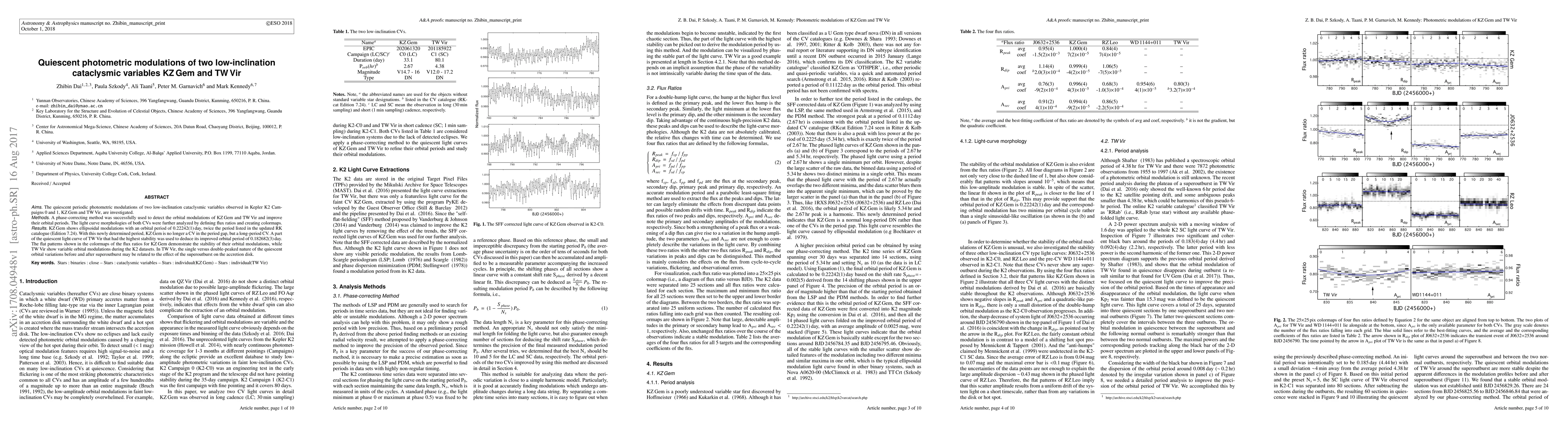 The quiescent periodic photometric modulations of two low-inclination cataclysmic variables observed in Kepler K2 Campaigns 0 and 1, KZ Gem and TW Vir, are investigated. A phase-correcting method was successfully used to detect the orbital modulations of KZ Gem and TW Vir and improve their orbital periods. The light curve morphologies of both CVs were further analyzed by defining flux ratios and creating colormaps. KZ Gem shows ellipsoidal modulations with an orbital period of 0.22242(1) day, twice the period listed in the updated RK catalogue (Edition 7.24). With this newly determined period, KZ Gem is no longer a CV in the period gap, but a long-period CV. A part of the quiescent light curve of TW Vir that had the highest stability was used to deduce its improved orbital period of 0.182682(3) day. The flat patterns shown in the colormaps of the flux ratios for KZ Gem demonstrate the stability of their orbital modulations, while TW Vir show variable orbital modulations during the K2 datasets. In TW Vir, the single versus double-peaked nature of the quiescent orbital variations before and after superoutburst may be related to the effect of the superoutburst on the accretion disk.