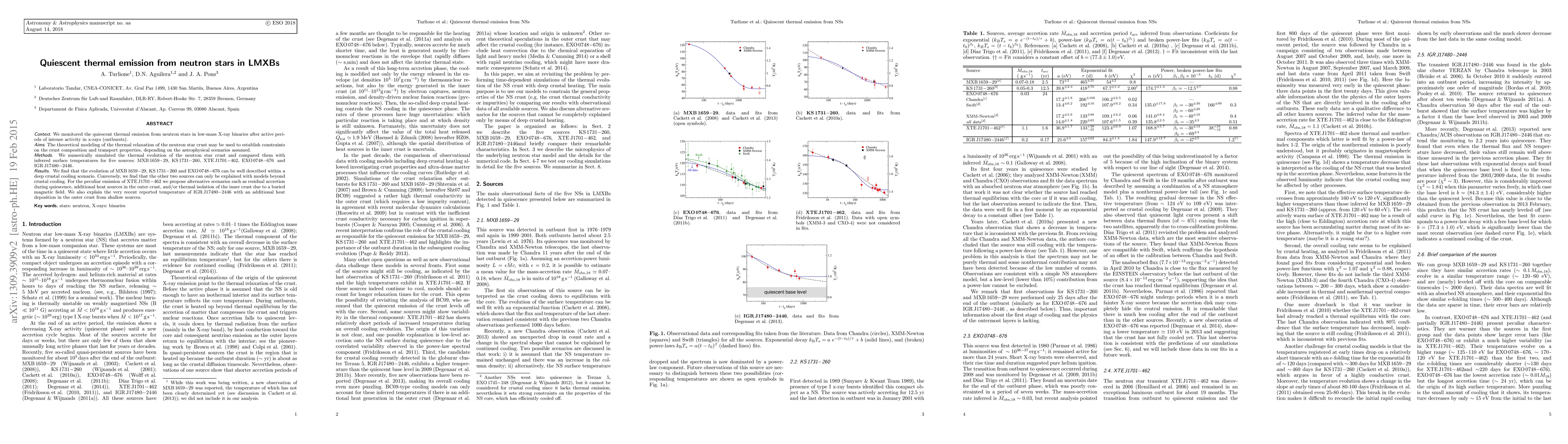 This paper investigates the quiescent thermal emission of neutron stars in low-mass X-ray binaries following intense outbursts. The study finds that three sources fit well with deep crustal cooling models, while two others require alternative explanations, such as residual accretion or additional heat sources in the outer crust.