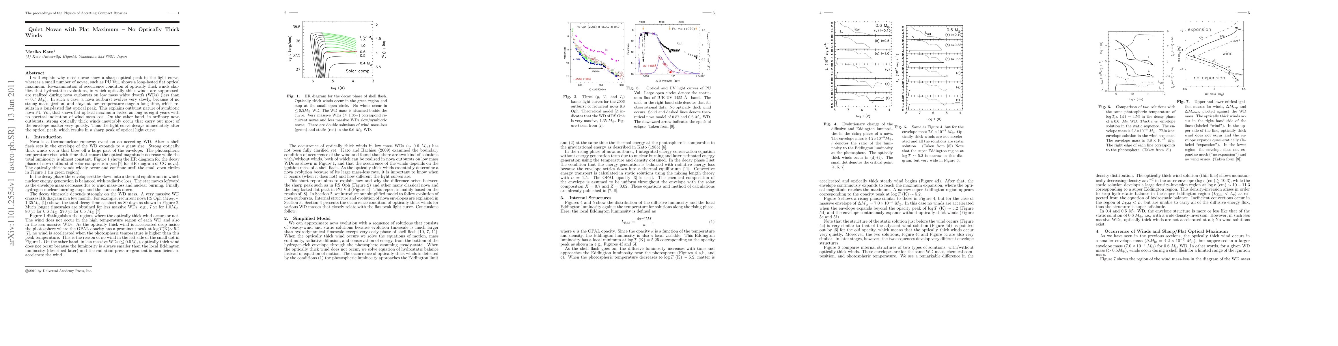 This paper explains the difference in light curves between typical novae and quiet novae like PU Vul, attributing the flat optical maximum in the latter to the absence of optically thick winds during hydrostatic evolutions in low mass white dwarfs, resulting in slow, prolonged outbursts. In contrast, ordinary novae exhibit sharp optical peaks due to rapid mass ejection via strong optically thick winds.