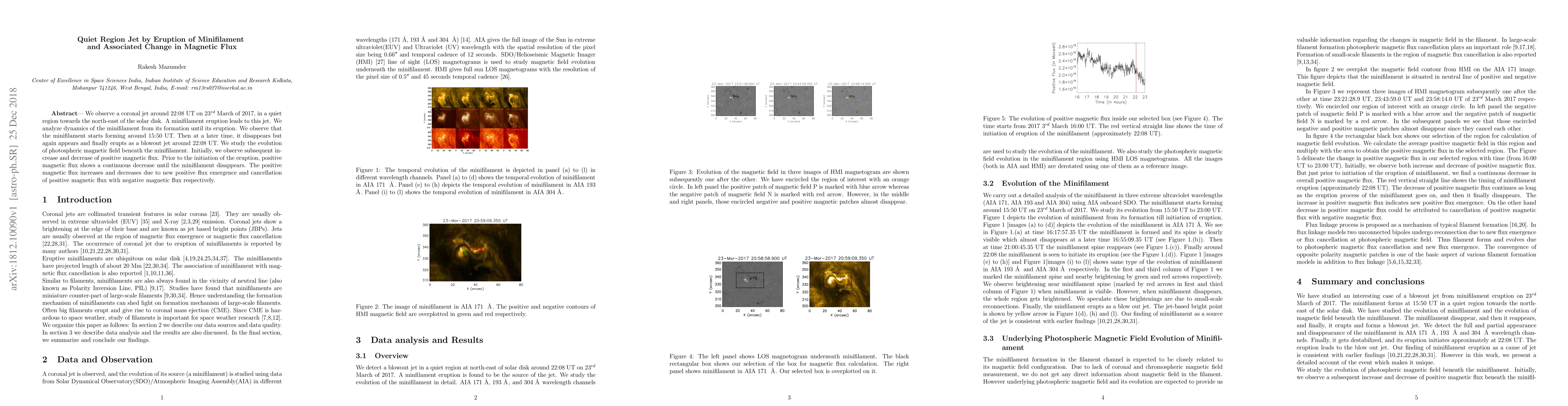 The research employs observations from the Solar Dynamics Observatory (SDO) including the Helioseismic and Magnetic Imager (HMI) and the Atmospheric Imaging Assembly (AIA) to study a minifilament eruption and its associated coronal jet in a quiet region of the Sun.