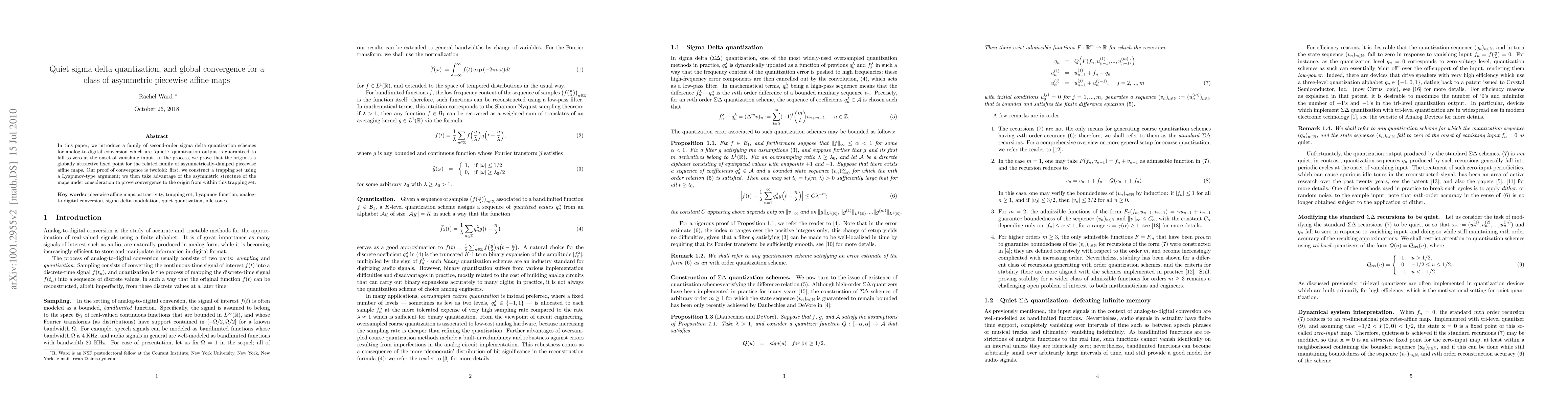 In this paper, we introduce a family of second-order sigma delta quantization schemes for analog-to-digital conversion which are `quiet' : quantization output is guaranteed to fall to zero at the onset of vanishing input. In the process, we prove that the origin is a globally attractive fixed point for the related family of asymmetrically-damped piecewise affine maps. Our proof of convergence is twofold: first, we construct a trapping set using a Lyapunov-type argument; we then take advantage of the asymmetric structure of the maps under consideration to prove convergence to the origin from within this trapping set.