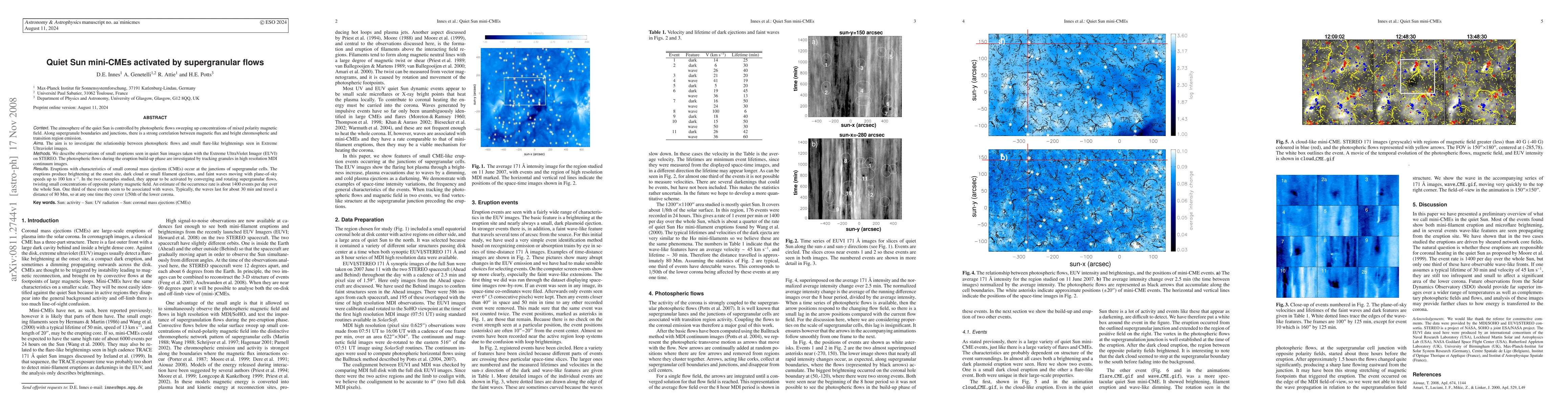This paper investigates small flare-like brightenings in the quiet Sun's atmosphere, termed mini-CMEs, which are activated by converging and rotating supergranular flows. Observations from the EUVI and MDI reveal that these eruptions occur at supergranule junctions, often associated with twisted magnetic fields and faint waves traveling up to 150 km/s.