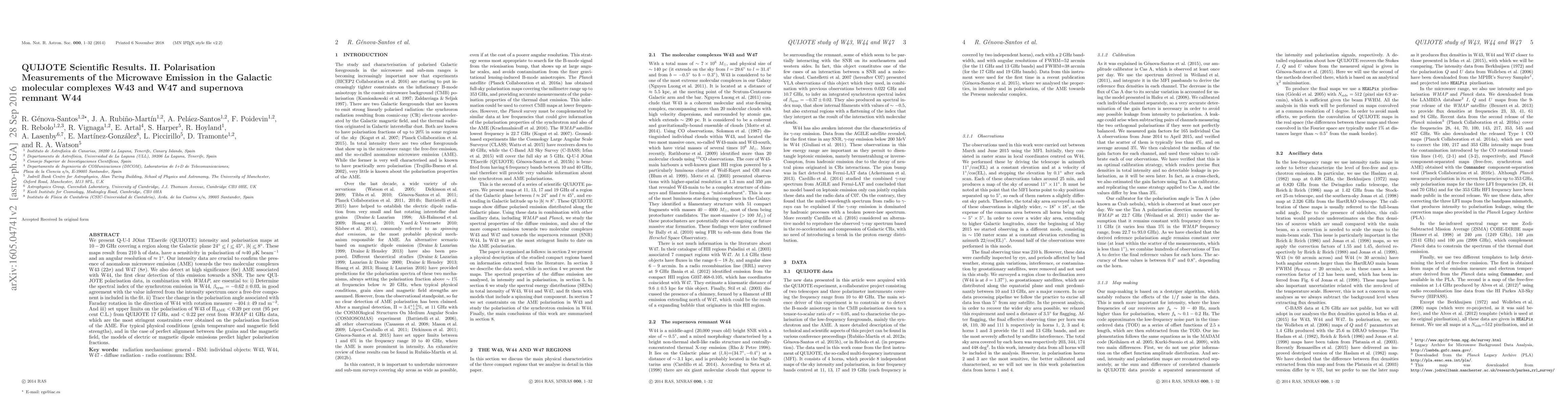 The QUIJOTE survey provides intensity and polarisation maps of the Galactic plane, confirming anomalous microwave emission (AME) in molecular complexes W43 and W47, and detecting AME in supernova remnant W44 for the first time. The polarisation data help determine the spectral index and Faraday rotation in W44, and set stringent upper limits on the polarisation of AME in W43.