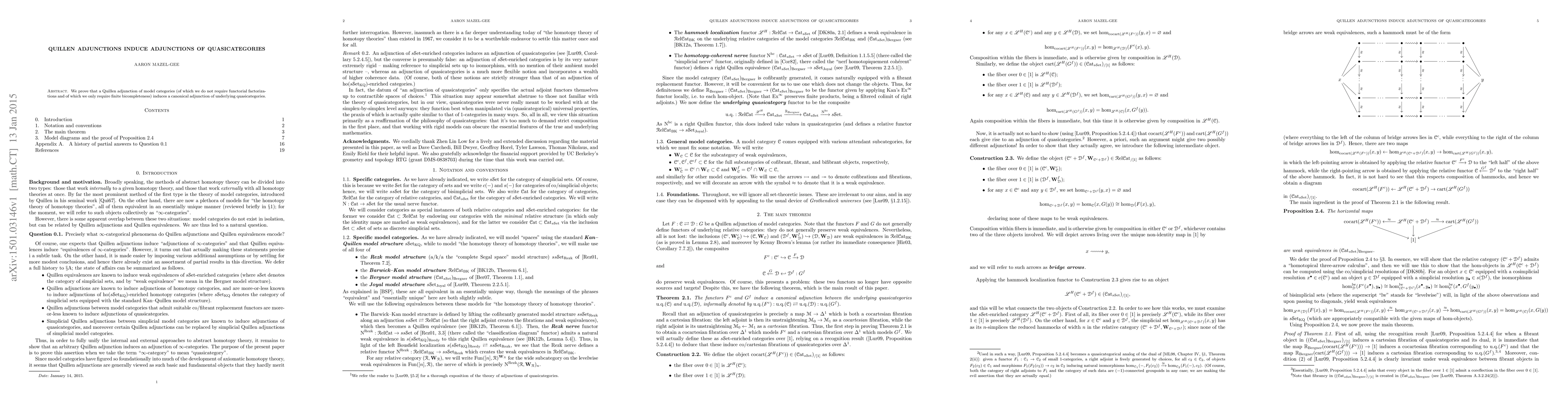 The paper proves that a Quillen adjunction of model categories induces a canonical adjunction of underlying quasicategories, without requiring functorial factorizations but only finite bicompleteness.