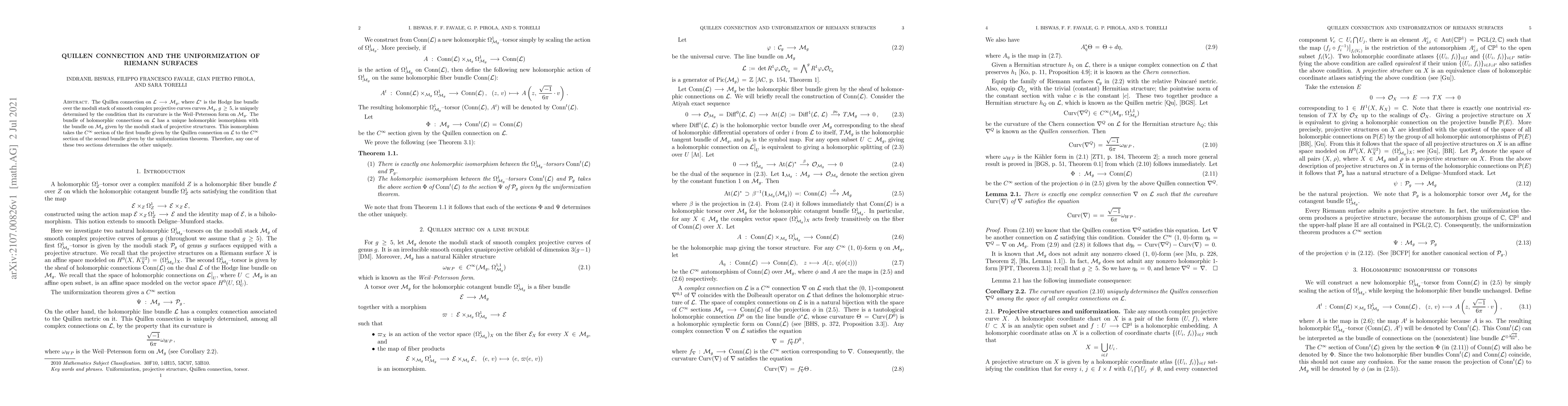 The Quillen connection on the Hodge line bundle over the moduli stack of Riemann surfaces is uniquely determined by its curvature being the Weil-Petersson form. This connection corresponds to the uniformization theorem via a unique holomorphic isomorphism, establishing a direct relationship between the two.