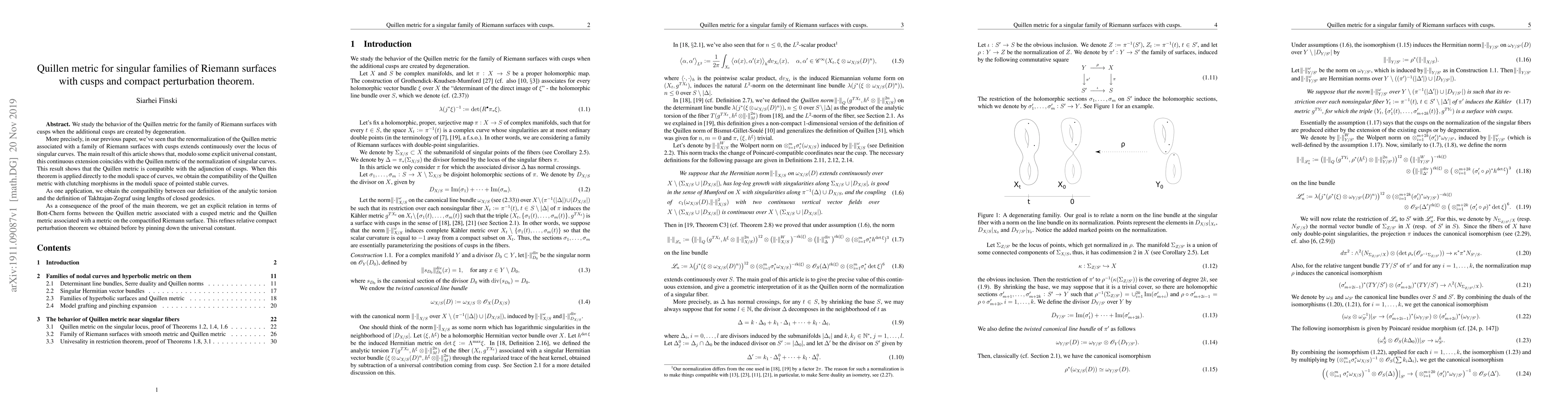 This paper investigates the Quillen metric for singular families of Riemann surfaces with cusps, demonstrating that the renormalization of the Quillen metric extends continuously over singular curves. The main result shows that this extension coincides with the Quillen metric of the normalized curves, confirming the metric's compatibility with cusp adjunction.
