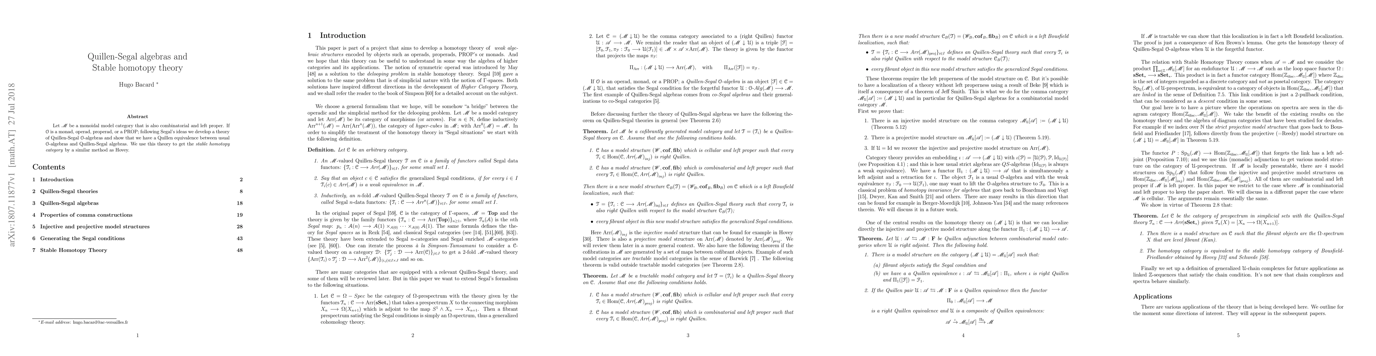 Let $\mathscr{M}$ be a monoidal model category that is also combinatorial and left proper. If $\mathscr{O}$ is a monad, operad, properad, or a PROP; following Segal's ideas we develop a theory of Quillen-Segal $\mathscr{O}$-algebras and show that we have a Quillen equivalence between usual $\mathscr{O}$-algebras and Quillen-Segal algebras. We use this theory to get the stable homotopy category by a similar method as Hovey.