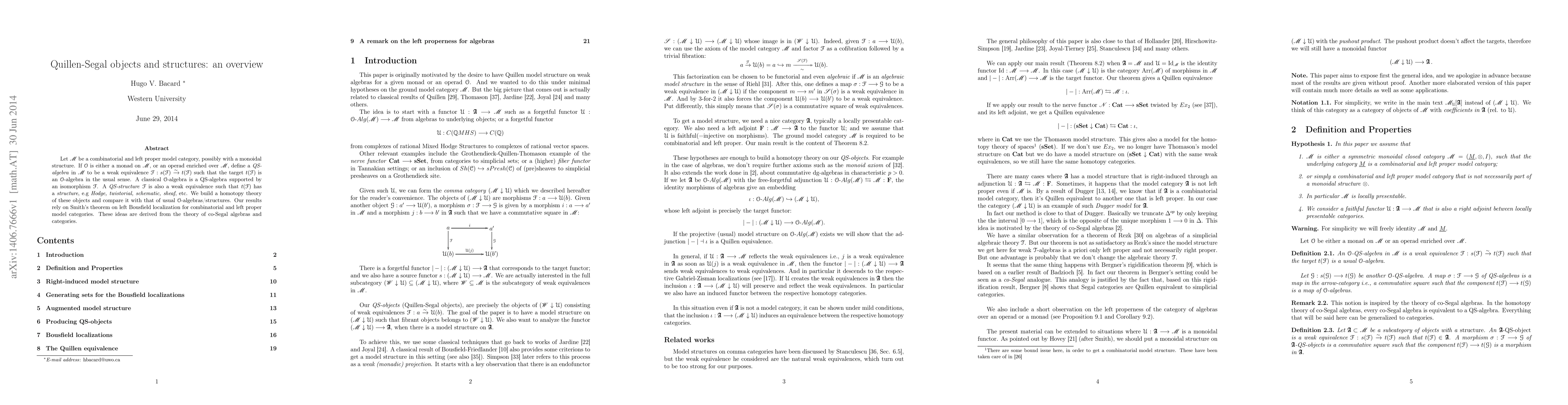 This paper introduces Quillen-Segal (QS) algebras and structures within combinatorial and left proper model categories, generalizing classical O-algebras. It constructs a homotopy theory for QS-objects, contrasting it with traditional O-algebra theories. The methodology relies on Smith's theorem for left Bousfield localization and co-Segal algebras/categories, offering new insights into various algebraic structures like Hodge, twistorial, schematic, and sheaf structures.