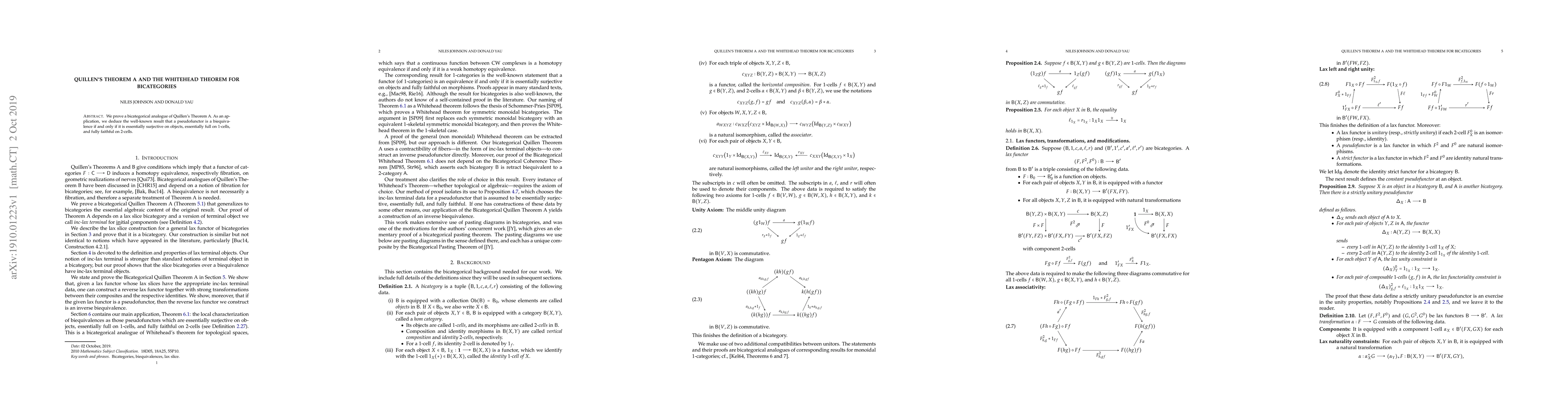 Summary: This paper establishes a bicategorical version of Quillen's Theorem A and uses it to demonstrate the equivalence of a pseudofunctor being a biequivalence with certain properties on objects, 1-cells, and 2-cells.