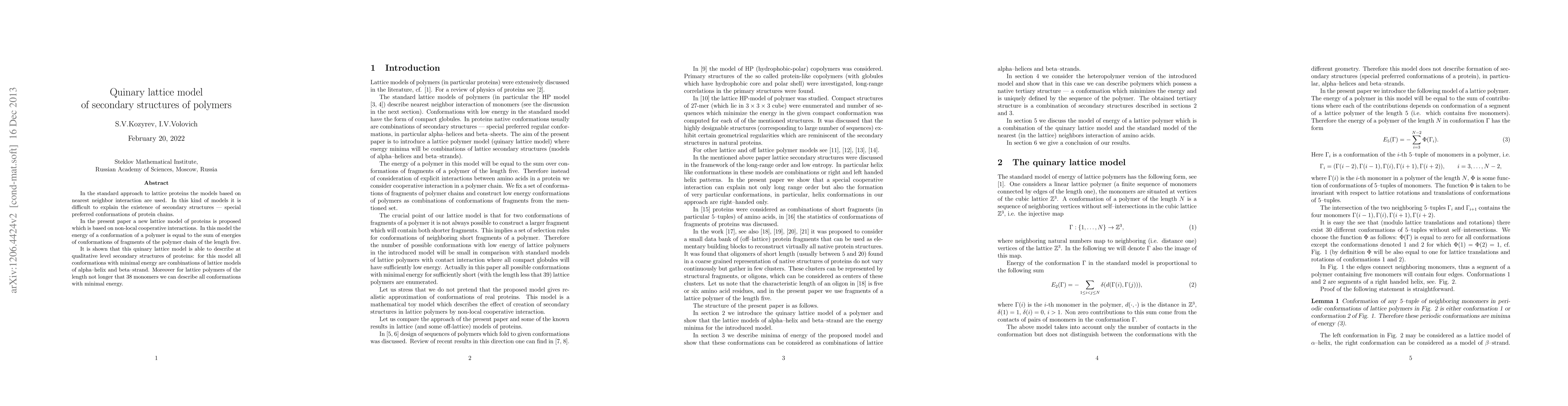This paper proposes a new quinary lattice model for protein secondary structures based on non-local cooperative interactions, demonstrating that it can qualitatively describe alpha-helix and beta-strand conformations, and accurately predict minimal energy conformations for polymers up to 38 monomers.