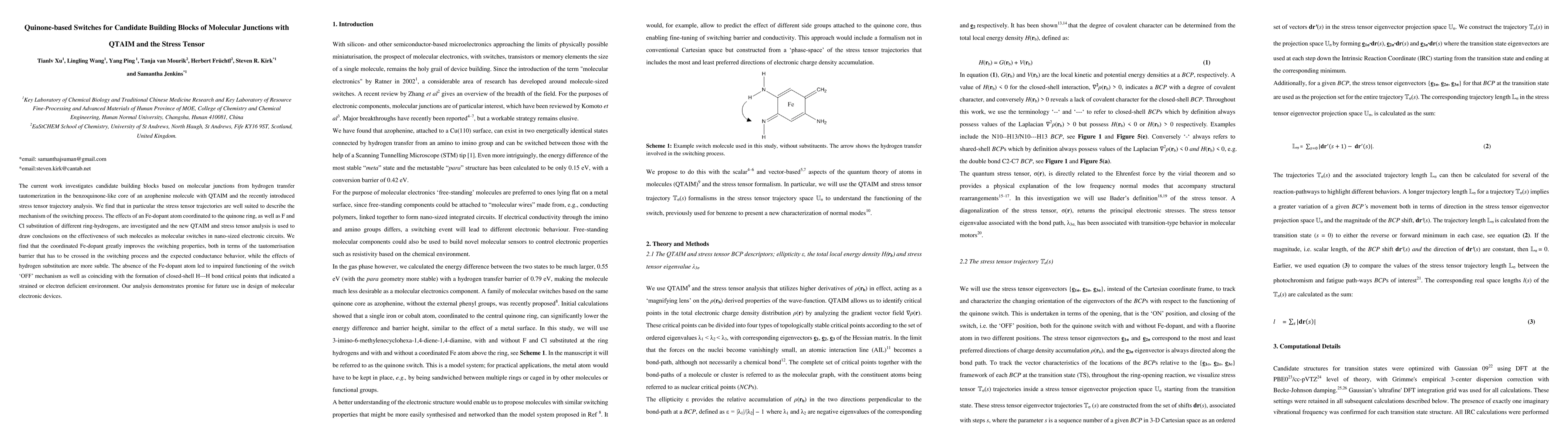 The current work investigates candidate building blocks based on molecular junctions from hydrogen transfer tautomerization in the benzoquinone-like core of an azophenine molecule with QTAIM and the recently-introduced stress tensor trajectory analysis. We find that in particular the stress tensor trajectories are well suited to describe the mechanism of the switching process. The effects of an Fe-dopant atom coordinated to the quinone ring, as well as F and Cl substitution of different ring-hydrogens, are investigated and the new QTAIM and stress tensor analysis is used to draw conclusions on the effectiveness of such molecules as molecular switches in nano-sized electronic circuits. We find that the coordinated Fe-dopant greatly improves the switching properties, both in terms of the tautomerisation barrier that has to be crossed in the switching process and the expected conductance behavior, while the effects of hydrogen substitution are more subtle. The absence of the Fe-dopant atom led to impaired functioning of the switch 'OFF' mechanism as well as coinciding with the formation of closed-shell H---H bond critical points that indicated a strained or electron deficient environment. Our analysis demonstrates promise for future use in design of molecular electronic devices.