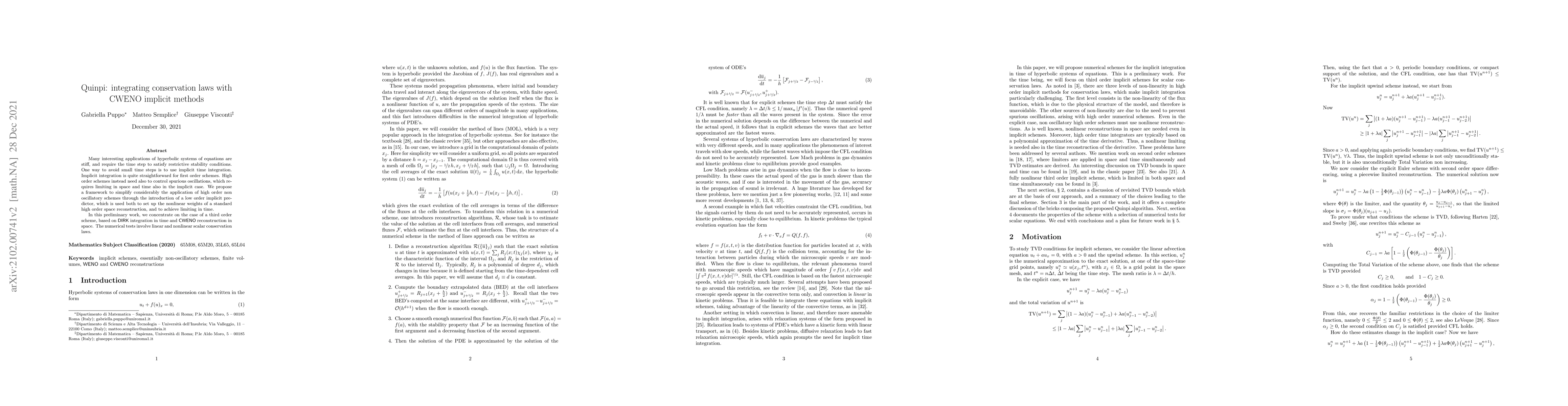 This paper introduces a method called Quinpi for solving stiff hyperbolic systems using high-order implicit integration. It employs a low-order implicit predictor for setting up nonlinear weights in high-order CWENO space reconstruction and for time-limiting, focusing on a third-order scheme based on DIRK integration and CWENO reconstruction. Numerical tests on scalar conservation laws validate the method.