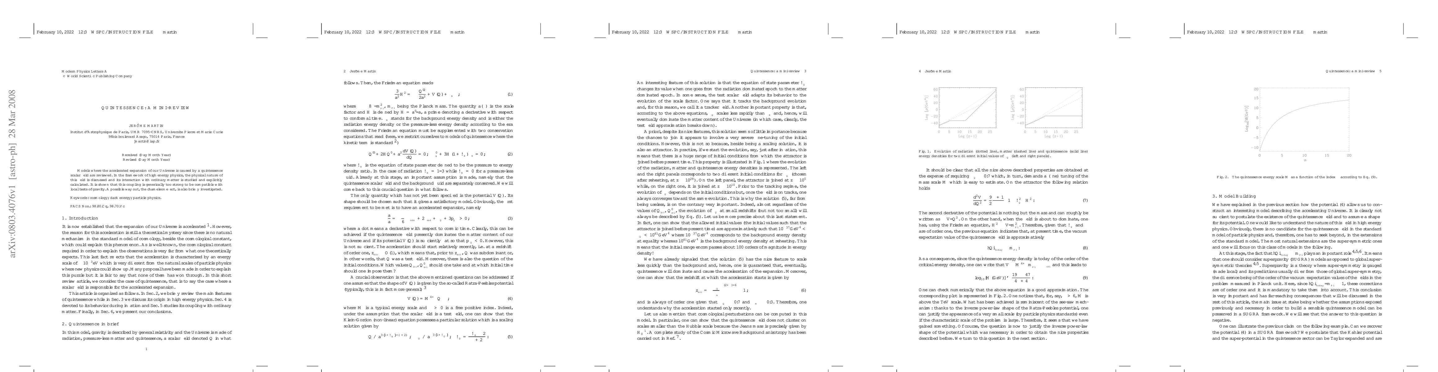 Models where the accelerated expansion of our Universe is caused by a quintessence scalar field are reviewed. In the framework of high energy physics, the physical nature of this field is discussed and its interaction with ordinary matter is studied and explicitly calculated. It is shown that this coupling is generically too strong to be compatible with local tests of gravity. A possible way out, the chameleon effect, is also briefly investigated.